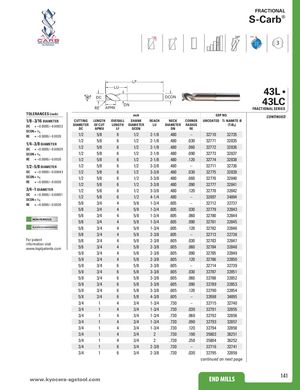 FRACTIONAL S-Carb® 38° POS ® 3 LF LU 43L • DC DCONDN 43LC RE APMX FRACTIONAL SERIES TOLERANCES (inch) inch EDP NO. CONTINUED 1/8–3/16 DIAMETER CUTTING LENGTH OVERALL SHANK REACH NECK CORNER UNCOATED Ti-NAMITE-B DC = +0.0000/–0.00032 DIAMETER OF CUT LENGTH DIAMETER LU DIAMETER RADIUSDCAPMXLFDCONDNRE (TiB2) DCON = h6RE= +0.0000/–0.0020 1/2 5/8 6 1/2 2-1/8 .480 – 32710 32735 1/4–3/8 DIAMETER 1/2 5/8 6 1/2 2-1/8 .480 .030 32771 32835 DC = +0.0000/–0.00035 1/2 5/8 6 1/2 2-1/8 .480 .060 32772 32836 DCON = h6 1/2 5/8 6 1/2 2-1/8 .480 .090 32773 32837 RE = +0.0000/–0.0020 1/2 5/8 6 1/2 2-1/8 .480 .120 32774 32838 1/2–5/8 DIAMETER 1/2 5/8 6 1/2 3-3/8 .480 – 32711 32736 DC = +0.0000/–0.00043 1/2 5/8 6 1/2 3-3/8 .480 .030 32775 32839 DCON = h6 1/2 5/8 6 1/2 3-3/8 .480 .060 32776 32840 RE = +0.0000/–0.0020 1/2 5/8 6 1/2 3-3/8 .480 .090 32777 32841 3/4–1 DIAMETER 1/2 5/8 6 1/2 3-3/8 .480 .120 32778 32842 DC = +0.0000/–0.00051 1/2 5/8 6 1/2 4-1/4 .480 – 32697 34894 DCON = h6 RE = +0.0000/–0.0020 5/8 3/4 4 5/8 1-3/4 .605 – 32712 32737 5/8 3/4 4 5/8 1-3/4 .605 .030 32779 32843 5/8 3/4 4 5/8 1-3/4 .605 .060 32780 32844 NON-FERROUS 5/8 3/4 4 5/8 1-3/4 .605 .090 32781 32845 PLASTICS/COMPOSITES 5/8 3/4 4 5/8 1-3/4 .605 .120 32782 32846 5/8 3/4 4 5/8 2-3/8 .605 – 32713 32738 For patent 5/8 3/4 4 5/8 2-3/8 .605 .030 32783 32847 information visitwww.ksptpatents.com 5/8 3/4 4 5/8 2-3/8 .605 .060 32784 32848 5/8 3/4 4 5/8 2-3/8 .605 .090 32785 32849 5/8 3/4 4 5/8 2-3/8 .605 .120 32786 32850 5/8 3/4 6 5/8 3-3/8 .605 – 32714 32739 5/8 3/4 6 5/8 3-3/8 .605 .030 32787 32851 5/8 3/4 6 5/8 3-3/8 .605 .060 32788 32852 5/8 3/4 6 5/8 3-3/8 .605 .090 32789 32853 5/8 3/4 6 5/8 3-3/8 .605 .120 32790 32854 5/8 3/4 6 5/8 4-3/8 .605 – 32698 34895 3/4 1 4 3/4 1-3/4 .730 – 32715 32740 3/4 1 4 3/4 1-3/4 .730 .030 32791 32855 3/4 1 4 3/4 1-3/4 .730 .060 32792 32856 3/4 1 4 3/4 1-3/4 .730 .090 32793 32857 3/4 1 4 3/4 1-3/4 .730 .120 32794 32858 3/4 1 4 3/4 2 .730 .190 35803 36251 3/4 1 4 3/4 2 .730 .250 35804 36252 3/4 1 6 3/4 2-3/8 .730 – 32716 32741 3/4 1 6 3/4 2-3/8 .730 .030 32795 32859 continued on next page www.kyocerEaN-DsgMstILoLoSl.com END MILLS 141