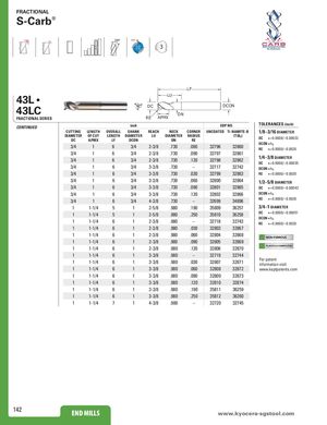 FRACTIONAL S-Carb® 38° POS ® 3 LF 43L • LU 43LC DC DCONDN FRACTIONAL SERIES RE APMX CONTINUED inch EDP NO. TOLERANCES (inch) CUTTING LENGTH OVERALL SHANK REACH NECK CORNER UNCOATED Ti-NAMITE-B 1/8–3/16 DIAMETER DIAMETER OF CUT LENGTH DIAMETER LU DIAMETER RADIUSDCAPMXLFDCONDNRE (TiB2) DC = +0.0000/–0.00032 3/4 1 6 3/4 2-3/8 .730 .060 32796 32860 DCON = h6RE= +0.0000/–0.0020 3/4 1 6 3/4 2-3/8 .730 .090 32797 32861 3/4 1 6 3/4 2-3/8 .730 .120 32798 32862 1/4–3/8 DIAMETERDC= +0.0000/–0.00035 3/4 1 6 3/4 3-3/8 .730 – 32717 32742 DCON = h6 3/4 1 6 3/4 3-3/8 .730 .030 32799 32863 RE = +0.0000/–0.0020 3/4 1 6 3/4 3-3/8 .730 .060 32800 32864 1/2–5/8 DIAMETER 3/4 1 6 3/4 3-3/8 .730 .090 32801 32865 DC = +0.0000/–0.00043 3/4 1 6 3/4 3-3/8 .730 .120 32802 32866 DCON = h6 3/4 1 6 3/4 4-3/8 .730 – 32699 34896 RE = +0.0000/–0.0020 1 1-1/4 5 1 2-5/8 .980 .190 35809 36257 3/4–1 DIAMETER 1 1-1/4 5 1 2-5/8 .980 .250 35810 36258 DC = +0.0000/–0.00051 1 1-1/4 6 1 2-3/8 .980 – 32718 32743 DCON = h6RE= +0.0000/–0.0020 1 1-1/4 6 1 2-3/8 .980 .030 32803 32867 1 1-1/4 6 1 2-3/8 .980 .060 32804 32868 NON-FERROUS 1 1-1/4 6 1 2-3/8 .980 .090 32805 32869 1 1-1/4 6 1 2-3/8 .980 .120 32806 32870 PLASTICS/COMPOSITES 1 1-1/4 6 1 3-3/8 .980 – 32719 32744 1 1-1/4 6 1 3-3/8 .980 .030 32807 32871 For patentinformation visit 1 1-1/4 6 1 3-3/8 .980 .060 32808 32872 www.ksptpatents.com 1 1-1/4 6 1 3-3/8 .980 .090 32809 32873 1 1-1/4 6 1 3-3/8 .980 .120 32810 32874 1 1-1/4 6 1 3-3/8 .980 .190 35811 36259 1 1-1/4 6 1 3-3/8 .980 .250 35812 36260 1 1-1/4 7 1 4-3/8 .980 – 32720 32745 142 END MILLS wwwE.kNyDoMceILraLS-sgstool.com
