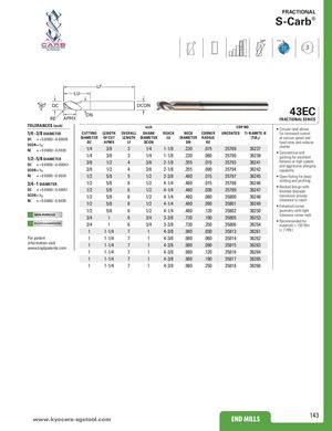 FRACTIONAL S-Carb® 38° POS ® 3 LF LU DC DCONDN 43EC RE APMX FRACTIONAL SERIES TOLERANCES (inch) inch EDP NO. • Circular land allows 1/4–3/8 DIAMETER CUTTING LENGTH OVERALL SHANK REACH NECK CORNER UNCOATED Ti-NAMITE-B for increased control DC = +0.0000/–0.00035 DIAMETER OF CUT LENGTH DIAMETER LU DIAMETER RADIUS (TiB2) at various speed and DCON = h6RE= +0.0000/–0.00201/2–5/8 DIAMETERDC= +0.0000/–0.00043DCAPMXLF DCON DN RE feed rates and reduces1/43/831/41-1/8.230.0153578936237chatter1/43/831/41-1/8.230.0603579036238• Symmetrical endgashing for excellent3/81/243/82-1/8.355.0153579336241balance at high speedsand aggressive plunging DCON = h6 3/8 1/2 4 3/8 2-1/8 .355 .090 35794 36242 capability RE = +0.0000/–0.0020 1/2 5/8 5 1/2 3-3/8 .480 .015 35797 36245 • Open fluting for deep 3/4–1 DIAMETERDC= +0.0000/–0.00051 1/2 5/8 6 1/2 4-1/4 .480 .015 35798 36246 slotting and profiling1/25/861/24-1/4.480.0303579936247• Necked design withblended diameter DCON = h6 1/2 5/8 6 1/2 4-1/4 .480 .060 35800 36248 transitions provide RE = +0.0000/–0.0020 clearance to reach1/25/861/24-1/4.480.0903580136249• Enhanced corner 1/2 5/8 6 1/2 4-1/4 .480 .120 35802 36250 geometry with tight NON-FERROUS 3/4 1 6 3/4 3-3/8 .730 .190 35805 36253 tolerance corner radii • Recommended for PLASTICS/COMPOSITES 3/4 1 6 3/4 3-3/8 .730 .250 35806 36254 materials ≤ 150 Bhn 1 1-1/4 7 1 4-3/8 .980 .030 35813 36261 (≤ 7 HRc) For patent 1 1-1/4 7 1 4-3/8 .980 .060 35814 36262 information visitwww.ksptpatents.com 1 1-1/4 7 1 4-3/8 .980 .090 35815 36263 1 1-1/4 7 1 4-3/8 .980 .120 35816 36264 1 1-1/4 7 1 4-3/8 .980 .190 35817 36265 1 1-1/4 7 1 4-3/8 .980 .250 35818 36266 www.kyocerEaN-DsgMstILoLoSl.com END MILLS 143