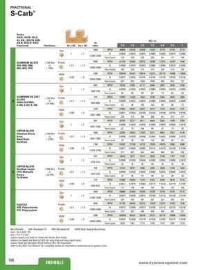 FRACTIONAL S-Carb® Series Ap 43CR, 43CB, 43LC, 43, 43L, 43LCB, 43B, Ae Ae DC • in 43LB, 43ELB, 43EC Vc Fractional Hardness Ae x DC Ap x DC (sfm) 1/8 1/4 3/8 1/2 5/8 3/4 1 Slot 1600 RPM 48896 24448 16299 12224 9779 8149 6112 1 ≤1 Fz 0.0009 0.0025 0.0045 0.0060 0.0065 0.0070 0.0085 (1280-1920) Feed (ipm) 132 183 220 220 191 171 156 ALUMINUM ALLOYS ≤ 150 Bhn Profile 2000 RPM 61120 30560 20373 15280 12224 10187 7640 2024, 5052, 5086, or ≤ 0.5 ≤ 1.5 Fz 0.0009 0.0025 0.0045 0.0060 0.0065 0.0070 0.0085 6061, 6073, 7075 ≤ 7 HRc (1600-2400) Feed (ipm) 165 229 275 275 238 214 195 HSM 3300 RPM 100848 50424 33616 25212 20170 16808 12606 ≤ 0.05 ≤2 Fz 0.0021 0.0055 0.0105 0.0140 0.0150 0.0165 0.0195 (2640-3960) Feed (ipm) 635 832 1059 1059 908 832 737 Slot 600 RPM 18336 9168 6112 4584 3667 3056 2292 1 ≤1 Fz 0.0009 0.0025 0.0045 0.0060 0.0065 0.0070 0.0085 (480-720) Feed (ipm) 50 69 83 83 72 64 58 ALUMINUM DIE CASTNALLOYS(HIGH SILICONE)A-390, A-392, B- 390≤ 125 BhnProfileor≤ 0.5≤ 77 HRb750 RPM 22920 11460 7640 5730 4584 3820 2865≤ 1.5Fz0.00090.00250.00450.00600.00650.00700.0085(600-900)Feed (ipm)6286103103898073 HSM 1240 RPM 37894 18947 12631 9474 7579 6316 4737 ≤ 0.05 ≤2 Fz 0.0021 0.0055 0.0105 0.0140 0.0150 0.0165 0.0195 (992-1488) Feed (ipm) 239 313 398 398 341 313 277 Slot 865 RPM 26434 13217 8811 6609 5287 4406 3304 1 ≤1 Fz 0.0008 0.0020 0.0040 0.0050 0.0055 0.0060 0.0070 (692-1038) Feed (ipm) 63 79 106 99 87 79 69 COPPER ALLOYSAluminum Bronze≤ 140 Bhn Profile 1080 RPM 33005 16502 11002 8251 6601 5501 4126 Brass or ≤ 0.5 ≤ 1.5 Fz 0.0008 0.0020 0.0040 0.0050 0.0055 0.0060 0.0070 Naval Brass ≤ 3 HRcRed Brass (864-1296) Feed (ipm) 79 99 132 124 109 99 87 HSM 1780 RPM 54397 27198 18132 13599 10879 9066 6800 ≤ 0.05 ≤2 Fz 0.0017 0.0045 0.0085 0.0115 0.0125 0.0140 0.0160 (1424-2136) Feed (ipm) 277 367 462 469 408 381 326 Slot 345 RPM 10543 5272 3514 2636 2109 1757 1318 1 ≤1 Fz 0.0008 0.0020 0.0040 0.0050 0.0055 0.0060 0.0070 (276-414) Feed (ipm) 25 32 42 40 35 32 28 COPPER ALLOYSBeryllium Copper≤ 200 Bhn Profile 430 RPM 13141 6570 4380 3285 2628 2190 1643 N C110, Malleable or ≤ 0.5 ≤ 1.5 Fz 0.0008 0.0020 0.0040 0.0050 0.0055 0.0060 0.0070 Bronze, ≤ 23 HRcTin Bronze (344-516) Feed (ipm) 32 39 53 49 43 39 34 HSM 710 RPM 21698 10849 7233 5424 4340 3616 2712 ≤ 0.05 ≤2 Fz 0.0017 0.0045 0.0085 0.0115 0.0125 0.0140 0.0160 (568-852) Feed (ipm) 111 146 184 187 163 152 130 Slot 1600 RPM 48896 24448 16299 12224 9779 8149 6112 1 ≤1 Fz 0.0015 0.0040 0.0075 0.0100 0.0110 0.0120 0.0140 (1280-1920) Feed (ipm) 220 293 367 367 323 293 257 PLASTICS Profile 2000 RPM 61120 30560 20373 15280 12224 10187 7640 ABS, Polycarbonate, ≤ 0.5 ≤ 1.5 Fz 0.0015 0.0040 0.0075 0.0100 0.0110 0.0120 0.0140 PVC, Polypropylene (1600-2400) Feed (ipm) 275 367 458 458 403 367 321 HSM 3300 RPM 100848 50424 33616 25212 20170 16808 12606 ≤ 0.05 ≤2 Fz 0.0034 0.0090 0.0170 0.0230 0.0250 0.0275 0.0320 (2640-3960) Feed (ipm) 1029 1361 1714 1740 1513 1387 1210 Bhn (Brinell) HRc (Rockwell C) HRb (Rockwell B) HSM (High Speed Machining) rpm = Vc x 3.82 / DC ipm = Fz x 3 x rpm reduce speed and feed for materials harder than listed reduce cut depth and feed by 50% for long flute and long reach tools reduce feed and Ae when finish milling (.02 x DC maximum) refer to the SGS Tool Wizard® for complete technical information (www.kyocera-sgstool.com) 148 END MILLS wwwE.kNyDoMceILraLS-sgstool.com