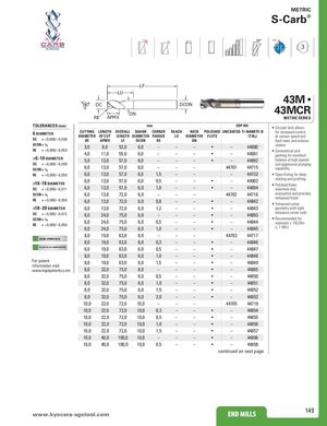 METRIC S-Carb® 38° POS ® 3 LF LU 43M • DC DCONDN 43MCR RE APMX METRIC SERIES TOLERANCES (mm) mm EDP NO. • Circular land allows 6 DIAMETERDC= +0,000/–0,008 CUTTING LENGTH OVERALL SHANK CORNER REACH NECK POLISHED UNCOATED Ti-NAMITE-BDIAMETEROF CUTLENGTHDIAMETERRADIUSLUDIAMETERFLUTE(TiB2)DCAPMXLFDCONREDNfor increased controlat various speed andfeed rates and reduces DCON = h6 3,0 8,0 52,0 6,0 – – – • – 44890 chatter RE = +0,000/–0,050>6–10 DIAMETER 4,0 11,0 55,0 6,0 – – – •5,013,057,06,0–––•–44891 • Symmetrical endgashing for excellent–44892balance at high speeds DC = +0,000/–0,009 and aggressive plunging DCON = h6 6,0 13,0 57,0 6,0 – – – 44701 44715 capability RE = +0,000/–0,050 6,0 13,0 57,0 6,0 1,5 – – – 44732 • Open fluting for deep >10–18 DIAMETERDC= +0,000/–0,011 6,0 13,0 57,0 6,0 0,5 – – •6,013,057,06,01,0––•–44902 slotting and profiling–44894• Polished flutesmaximize chip DCON = h6RE= +0,000/–0,050 6,0 13,0 72,0 6,0 – – – 44702 44716 evacuation and providesenhanced finish6,013,072,06,00,8––•–44842• Enhanced corner >18–20 DIAMETER 6,0 13,0 72,0 6,0 1,2 – – • – 44843 geometry with tight DC = +0,000/–0,013 6,0 24,0 75,0 6,0 – – – • – 44893 tolerance corner radii DCON = h6RE= +0,000/–0,050 6,0 24,0 75,0 6,0 0,5 – – •6,024,075,06,01,0––• • Recommended for–44844materials ≤ 150 Bhn–44845(≤ 7 HRc) 8,0 19,0 63,0 8,0 – – – 44703 44717 NON-FERROUS 8,0 19,0 63,0 8,0 0,3 – – • – 44846 PLASTICS/COMPOSITES 8,0 19,0 63,0 8,0 0,5 – – • – 44847 8,0 19,0 63,0 8,0 1,0 – – • – 44848 For patentinformation visit 8,0 19,0 63,0 8,0 1,5 – – • – 44849 www.ksptpatents.com 8,0 32,0 75,0 8,0 – – – • – 44895 8,0 32,0 75,0 8,0 0,5 – – • – 44850 8,0 32,0 75,0 8,0 1,0 – – • – 44851 8,0 32,0 75,0 8,0 1,5 – – • – 44852 8,0 32,0 75,0 8,0 2,0 – – • – 44853 10,0 22,0 72,0 10,0 – – – 44705 44719 10,0 22,0 72,0 10,0 0,3 – – • – 44854 10,0 22,0 72,0 10,0 0,5 – – • – 44855 10,0 22,0 72,0 10,0 1,0 – – • – 44856 10,0 22,0 72,0 10,0 1,5 – – • – 44857 10,0 40,0 100,0 10,0 – – – • – 44896 10,0 40,0 100,0 10,0 0,5 – – • – 44858 continued on next page www.kyocerEaN-DsgMstILoLoSl.com END MILLS 149