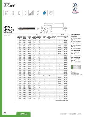 METRIC S-Carb® 38° POS ® 3 LF LU 43M • 43MCR DC DCONDN METRIC SERIES RE APMX CONTINUED mm EDP NO. TOLERANCES (mm) CUTTING LENGTH OVERALL SHANK CORNER REACH NECK POLISHED UNCOATED Ti-NAMITE-B 6 DIAMETER DIAMETER OF CUT LENGTH DIAMETER RADIUS LU DIAMETER FLUTE (TiB2) DC APMX LF DCON RE DN DC = +0,000/–0,008 10,0 40,0 100,0 10,0 1,0 – – • – 44859 DCON = h6 10,0 40,0 100,0 10,0 1,5 – – • – 44860 RE = +0,000/–0,050 10,0 40,0 100,0 10,0 2,0 – – • – 44861 >6–10 DIAMETER 12,0 26,0 83,0 12,0 – – – 44708 44722 DC = +0,000/–0,009 12,0 26,0 83,0 12,0 1,5 – – 44814 44733 DCON = h6RE= +0,000/–0,050 12,0 26,0 83,0 12,0 2,0 – – 44815 44826 12,0 26,0 83,0 12,0 2,5 – – 44816 44827 >10–18 DIAMETERDC= +0,000/–0,011 12,0 26,0 83,0 12,0 3,0 – – 44817 44734 DCON = h6 12,0 48,0 100,0 12,0 – – – • – 44897 RE = +0,000/–0,050 12,0 48,0 100,0 12,0 0,5 – – • – 44862 >18–20 DIAMETER 12,0 48,0 100,0 12,0 1,0 – – • – 44863 DC = +0,000/–0,013 12,0 48,0 100,0 12,0 1,5 – – • – 44864 DCON = h6 12,0 48,0 100,0 12,0 2,0 – – • – 44865 RE = +0,000/–0,050 12,0 48,0 100,0 12,0 2,5 – – • – 44866 12,0 48,0 100,0 12,0 3,0 – – • – 44867 NON-FERROUS 14,0 30,0 89,0 14,0 – – – • – 44898 PLASTICS/COMPOSITES 14,0 30,0 89,0 14,0 1,0 – – • – 44868 14,0 30,0 89,0 14,0 2,0 – – • – 44869 For patent 14,0 30,0 89,0 14,0 3,0 – – • – 44870 information visitwww.ksptpatents.com 14,0 18,0 125,0 14,0 – 45,0 13,49 • – 44899 16,0 32,0 92,0 16,0 – – – 44711 44725 16,0 32,0 92,0 16,0 1,5 – – 44818 44735 16,0 32,0 92,0 16,0 2,0 – – 44819 44828 16,0 32,0 92,0 16,0 2,5 – – 44820 44829 16,0 32,0 92,0 16,0 3,0 – – 44821 44736 16,0 32,0 92,0 16,0 4,0 – – • – 44871 16,0 64,0 125,0 16,0 – – – • – 44900 16,0 64,0 125,0 16,0 0,5 – – • – 44872 16,0 64,0 125,0 16,0 1,0 – – • – 44873 16,0 64,0 125,0 16,0 1,5 – – • – 44874 16,0 64,0 125,0 16,0 2,0 – – • – 44875 16,0 64,0 125,0 16,0 2,5 – – • – 44876 continued on next page 150 END MILLS wwwE.kNyDoMceILraLS-sgstool.com