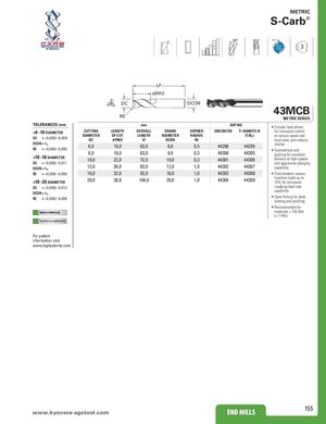 METRIC S-Carb® 38° POS ® 3 LF APMX DC DCON 43MCB RE METRIC SERIES TOLERANCES (mm) mm EDP NO. • Circular land allows >6–10 DIAMETER CUTTING LENGTH OVERALL SHANK CORNER UNCOATED Ti-NAMITE-B for increased control DIAMETER OF CUT LENGTH DIAMETER RADIUSDC= +0,000/–0,009DCAPMXLFDCONRE (TiB2) at various speed andfeed rates and reduces DCON = h6RE= +0,000/–0,050>10–18 DIAMETER6,0 19,0 63,0 6,08,019,063,08,010,022,072,010,00,544298 44299 chatter0,34430044305• Symmetrical endgashing for excellent0,34430144306balance at high speeds DC = +0,000/–0,011 and aggressive plunging DCON = h6 12,0 26,0 83,0 12,0 1,0 44302 44307 capability RE = +0,000/–0,050 16,0 32,0 92,0 16,0 1,0 44303 44308 • Chip breakers reduce >18–20 DIAMETER 20,0 38,0 104,0 20,0 1,0 44304 44309 machine loads up to15% for increased DC = +0,000/–0,013 roughing feed rate DCON = h6 capability RE = +0,000/–0,050 • Open fluting for deepslotting and profiling • Recommended for NON-FERROUS materials ≤ 150 Bhn (≤ 7 HRc) PLASTICS/COMPOSITES For patent information visit www.ksptpatents.com www.kyocerEaN-DsgMstILoLoSl.com END MILLS 155