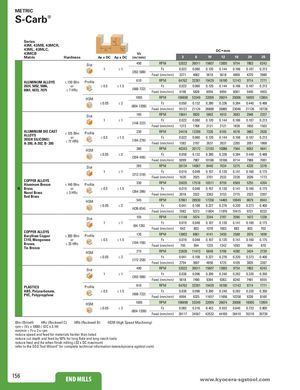 METRIC S-Carb® Series Ap 43M, 43MB, 43MCR, 43ML, 43MLC, Ae Ae DC • mm 43MCB Vc Metric Hardness Ae x DC Ap x DC (m/min) 3 6 10 12 16 20 25 Slot 490 RPM 52022 26011 15607 13005 9754 7803 6243 1 ≤1 Fz 0.022 0.060 0.120 0.144 0.166 0.187 0.213 (392-588) Feed (mm/min) 3371 4682 5618 5618 4869 4370 3980 ALUMINUM ALLOYS ≤ 150 Bhn Profile 610 RPM 64762 32381 19429 16190 12143 9714 7771 2024, 5052, 5086, or ≤ 0.5 ≤ 1.5 Fz 0.022 0.060 0.120 0.144 0.166 0.187 0.213 6061, 6073, 7075 ≤ 7 HRc (488-732) Feed (mm/min) 4196 5828 6994 6994 6061 5440 4955 HSM 1005 RPM 106698 53349 32009 26674 20006 16005 12804 ≤ 0.05 ≤2 Fz 0.050 0.132 0.280 0.336 0.384 0.440 0.488 (804-1206) Feed (mm/min) 16131 21124 26888 26885 23046 21126 18726 Slot 185 RPM 19641 9820 5892 4910 3683 2946 2357 1 ≤1 Fz 0.022 0.060 0.120 0.144 0.166 0.187 0.213 (148-222) Feed (mm/min) 1273 1768 2121 2121 1838 1650 1503 ALUMINUM DIE CASTALLOYS(HIGH SILICONE)A-390, A-392, B- 390≤ 125 BhnProfileor≤ 0.5≤ 77 HRb 230 RPM 24418 12209 7326 6105 4578 3663 2930≤ 1.5Fz0.0220.0600.1200.1440.1660.1870.213(184-276)Feed (mm/min)1582219726372637228520511868 HSM 380 RPM 40343 20172 12103 10086 7564 6052 4841 ≤ 0.05 ≤2 Fz 0.050 0.132 0.280 0.336 0.384 0.440 0.488 (304-456) Feed (mm/min) 6099 7987 10166 10166 8714 7988 7081 Slot 265 RPM 28134 14067 8440 7034 5275 4220 3376 1 ≤1 Fz 0.019 0.048 0.107 0.120 0.141 0.160 0.175 (212-318) Feed (mm/min) 1620 2025 2701 2532 2228 2026 1773 COPPER ALLOYSAluminum Bronze≤ 140 Bhn Profile 330 RPM 35035 17518 10511 8759 6569 5255 4204 N Brass or ≤ 0.5 ≤ 1.5 Fz 0.019 0.048 0.107 0.120 0.141 0.160 0.175 Naval Brass ≤ 3 HRcRed Brass (264-396) Feed (mm/min) 2018 2522 3363 3153 2775 2523 2207 HSM 545 RPM 57861 28930 17358 14465 10849 8679 6943 ≤ 0.05 ≤2 Fz 0.041 0.108 0.227 0.276 0.320 0.373 0.400 (436-654) Feed (mm/min) 7082 9373 11804 11976 10415 9721 8332 Slot 105 RPM 11148 5574 3344 2787 2090 1672 1338 1 ≤1 Fz 0.019 0.048 0.107 0.120 0.141 0.160 0.175 (84-126) Feed (mm/min) 642 803 1070 1003 883 803 702 COPPER ALLOYSBeryllium Copper≤ 200 BhnProfile 130 RPM 13802 6901 4141 3450 2588 2070 1656 C110, Manganese or ≤ 0.5 ≤ 1.5 Fz 0.019 0.048 0.107 0.120 0.141 0.160 0.175 Bronze, ≤ 23 HRcTin Bronze (104-156) Feed (mm/min) 795 994 1325 1242 1093 994 870 HSM 215 RPM 22826 11413 6848 5706 4280 3424 2739 ≤ 0.05 ≤2 Fz 0.041 0.108 0.227 0.276 0.320 0.373 0.400 (172-258) Feed (mm/min) 2794 3697 4656 4725 4109 3835 3287 Slot 490 RPM 52022 26011 15607 13005 9754 7803 6243 1 ≤1 Fz 0.036 0.096 0.200 0.240 0.282 0.320 0.350 (392-588) Feed (mm/min) 5618 7490 9364 9363 8240 7491 6555 PLASTICS Profile 610 RPM 64762 32381 19429 16190 12143 9714 7771 ABS, Polycarbonate, ≤ 0.5 ≤ 1.5 Fz 0.036 0.096 0.200 0.240 0.282 0.320 0.350 PVC, Polypropylene (488-732) Feed (mm/min) 6994 9325 11657 11656 10258 9326 8160 HSM 1005 RPM 106698 53349 32009 26674 20006 16005 12804 ≤ 0.05 ≤2 Fz 0.082 0.216 0.453 0.552 0.640 0.733 0.800 (804-1206) Feed (mm/min) 26117 34567 43532 44169 38410 35210 30730 Bhn (Brinell) HRc (Rockwell C) HRb (Rockwell B) HSM (High Speed Machining) rpm = (Vc x 1000) / (DC x 3.14) mm/min = Fz x 3 x rpm reduce speed and feed for materials harder than listed reduce cut depth and feed by 50% for long flute and long reach tools reduce feed and Ae when finish milling (.02 x DC maximum) refer to the SGS Tool Wizard® for complete technical information (www.kyocera-sgstool.com) 156 END MILLS wwwE.kNyDoMceILraLS-sgstool.com