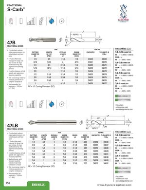 FRACTIONAL S-Carb® 35° POS ® 2 LF APMX DC DCON 47B FRACTIONAL SERIES RE • Circular land reduces inch EDP NO. TOLERANCES (inch) edge aggressiveness for CUTTING LENGTH OVERALL SHANK UNCOATED Ti-NAMITE-B 1/8–3/16 DIAMETER varied speed and feed DIAMETER OF CUT LENGTH DIAMETER (TiB2) DC = +0.0000/–0.00032 rates DC APMX LF DCON DCON = h6 • 2 Flutes effectivelymanage the large sizeand volume of chips1/83/163/89/16 1-1/2 1/8 34630 34669 RE = +.0005/–.000523/1634631346701/4–3/8 DIAMETER produced during the 1/4 3/4 2-1/2 1/4 34632 34671 DC = +0.0000/–0.00035 aggressive machiningprocess 5/16 13/16 2-1/2 5/16 34633 34672 DCON = h6 • Excellent balance at high 3/8 1 2-1/2 3/8 34634 34673 RE = +.0005/–.0005 speeds and aggressiveplunging capability1/2 1-1/4 3-1/4 1/2 34635 34674 1/2–5/8 DIAMETERDC= +0.0000/–0.00043 • Ball nose design ideal for 5/8 1-5/8 3-3/4 5/8 34636 34675 DCON = h6 finishing operations incomplex workpieces3/4 1-5/8 4 3/4 34637 34676 RE = +.0005/–.0005 • Recommended for 1 2 4-1/2 1 34638 34677 3/4–1 DIAMETER materials ≤ 150 Bhn RE = 1/2 Cutting Diameter (DC) DC = +0.0000/–0.00051 (≤ 7 HRc) DCON = h6 RE = +.0005/–.0005 NON-FERROUS PLASTICS/COMPOSITES 35° POS 2 For patent information visit www.ksptpatents.com LF LU DC DCON 47LB DN FRACTIONAL SERIES RE APMX • Circular land reduces inch EDP NO. TOLERANCES (inch) edge aggressiveness for CUTTING LENGTH OVERALL SHANK REACH NECK UNCOATED Ti-NAMITE-B 1/4–3/8 DIAMETER varied speed and feed DIAMETER OF CUT LENGTH DIAMETER LU DIAMETER (TiB2)ratesDCAPMXLFDCONDN• 2 Flutes effectivelymanage the large size1/43/841/42-1/8.2353465034686DC= +0.0000/–0.00035DCON = h6RE= +.0005/–.0005 and volume of chipsproduced during theaggressive machining3/81/2 4 3/8 2-1/8 .360 34651 34687 1/2–5/8 DIAMETER1/25/861/22-1/8.4853465234688DC= +0.0000/–0.00043 process 1/2 5/8 6 1/2 3-3/8 .485 34653 34689 DCON = h6 • Excellent balance at highspeeds and aggressive5/83/4plunging capability5/83/4 66 5/8 2-3/8 .610 34655 34691 RE = +.0005/–.00055/83-3/8.61034654346903/4–1 DIAMETER • Necked design withblended diameter DC = +0.0000/–0.000513/4163/42-1/2.7353465634693DCON = h6 transitions provide 3/4 1 6 3/4 3-3/8 .735 34657 34692 RE = +.0005/–.0005 clearance to reach • Ball nose design ideal for RE = 1/2 Cutting Diameter (DC)finishing operations in NON-FERROUS complex workpieces PLASTICS/COMPOSITES • Recommended for materials ≤ 150 Bhn(≤ 7 HRc) For patentinformation visit www.ksptpatents.com 158 END MILLS wwwE.kNyDoMceILraLS-sgstool.com