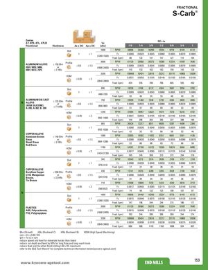 FRACTIONAL S-Carb® Ap Series Ae Ae DC • in 47, 47B, 47L, 47LB Vc Fractional Hardness Ae x DC Ap x DC (sfm) 1/8 1/4 3/8 1/2 5/8 3/4 1 Slot 1600 RPM 48896 24448 16299 12224 9779 8149 6112 1 ≤1 Fz 0.0009 0.0025 0.0045 0.0060 0.0065 0.0070 0.0085 (1280-1920) Feed (ipm) 88 122 147 147 127 114 104 ALUMINUM ALLOYS2024, 5052, 5086,≤ 150 BhnProfileor ≤ 0.5 2000 RPM≤ 1.5Fz(1600-2400)611203056020373 15280 12224 10187 76400.00090.00250.00450.00600.00650.00700.0085 6061, 6073, 7075 ≤ 7 HRc Feed (ipm) 110 153 183 183 159 143 130 3300 RPM 100848 50424 33616 25212 20170 16808 12606 HSM ≤ 0.05 ≤2 Fz 0.0021 0.0055 0.0105 0.0140 0.0150 0.0165 0.0195 (2640-3960) Feed (ipm) 424 555 706 706 605 555 492 Slot 600 RPM 18336 9168 6112 4584 3667 3056 2292 1 ≤1 Fz 0.0009 0.0025 0.0045 0.0060 0.0065 0.0070 0.0085 (480-720) Feed (ipm) 33 46 55 55 48 43 39 ALUMINUM DIE CASTNALLOYS(HIGH SILICONE)A-390, A-392, B- 390≤ 125 BhnProfileor≤ 77 HRb≤ 0.5750 RPM 22920 11460 7640 5730 4584 3820 2865≤ 1.5Fz0.00090.00250.00450.00600.00650.00700.0085(600-900)Feed (ipm)41576969605349 HSM 1240 RPM 37894 18947 12631 9474 7579 6316 4737 ≤ 0.05 ≤2 Fz 0.0021 0.0055 0.0105 0.0140 0.0150 0.0165 0.0195 (992-1488) Feed (ipm) 159 208 265 265 227 208 185 Slot 865 RPM 26434 13217 8811 6609 5287 4406 3304 1 ≤1 Fz 0.0008 0.0020 0.0040 0.0050 0.0055 0.0060 0.0070 (692-1038) Feed (ipm) 42 53 70 66 58 53 46 COPPER ALLOYSAluminum Bronze≤ 140 Bhn Profile 1080 RPM 33005 16502 11002 8251 6601 5501 4126 Brass or ≤ 0.5 ≤ 1.5 Fz 0.0008 0.0020 0.0040 0.0050 0.0055 0.0060 0.0070 Naval Brass ≤ 3 HRcRed Brass (864-1296) Feed (ipm) 53 66 88 83 73 66 58 HSM 1780 RPM 54397 27198 18132 13599 10879 9066 6800 ≤ 0.05 ≤2 Fz 0.0017 0.0045 0.0085 0.0115 0.0125 0.0140 0.0160 (1424-2136) Feed (ipm) 185 245 308 313 272 254 218 Slot 345 RPM 10543 5272 3514 2636 2109 1757 1318 1 ≤1 Fz 0.0008 0.0020 0.0040 0.0050 0.0055 0.0060 0.0070 (276-414) Feed (ipm) 17 21 28 26 23 21 18 COPPER ALLOYSBeryllium Copper≤ 200 BhnProfile 430 RPM 13141 6570 4380 3285 2628 2190 1643 C110, Manganese or ≤ 0.5 ≤ 1.5 Fz 0.0008 0.0020 0.0040 0.0050 0.0055 0.0060 0.0070 Bronze, ≤ 23 HRcTin Bronze (344-516) Feed (ipm) 21 26 35 33 29 26 23 HSM 710 RPM 21698 10849 7233 5424 4340 3616 2712 ≤ 0.05 ≤2 Fz 0.0017 0.0045 0.0085 0.0115 0.0125 0.0140 0.0160 (568-852) Feed (ipm) 74 98 123 125 108 101 87 N Slot 1600 RPM 48896 24448 16299 12224 9779 8149 6112 1 ≤1 Fz 0.0015 0.0040 0.0075 0.0100 0.0110 0.0120 0.0140 (1280-1920) Feed (ipm) 147 196 244 244 215 196 171 PLASTICS Profile 2000 RPM 61120 30560 20373 15280 12224 10187 7640 ABS, Polycarbonate, ≤ 0.5 ≤ 1.5 Fz 0.0015 0.0040 0.0075 0.0100 0.0110 0.0120 0.0140 PVC, Polypropylene (1600-2400) Feed (ipm) 183 244 306 306 269 244 214 HSM 3300 RPM 100848 50424 33616 25212 20170 16808 12606 ≤ 0.05 ≤2 Fz 0.0034 0.0090 0.0170 0.0230 0.0250 0.0275 0.0320 (2640-3960) Feed (ipm) 686 908 1143 1160 1008 924 807 Bhn (Brinell) HRc (Rockwell C) HRb (Rockwell B) HSM (High Speed Machining) rpm = Vc x 3.82 / DC ipm = Fz x 2 x rpm reduce speed and feed for materials harder than listed reduce cut depth and feed by 50% for long flute and long reach tools reduce feed and Ae when finish milling (.02 x DC maximum) refer to the SGS Tool Wizard® for complete technical information (www.kyocera-sgstool.com) www.kyocerEaN-DsgMstILoLoSl.com END MILLS 159