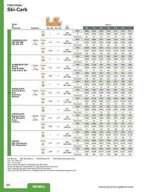 FRACTIONAL Ski-Carb Ap Series Ae Ae DC • in 44 Vc Fractional Hardness Ae x DC Ap x DC (sfm) 1/8 1/4 3/8 1/2 5/8 3/4 1 Slot 1 RPM 48896 24448 16299 12224 9779 8149 6112≤11600(1280-1920)Fz0.00090.00250.00450.00600.00650.00700.0085 Feed (ipm) 88 122 147 147 127 114 104 ALUMINUM ALLOYS ≤ 150 Bhn Profile2024, 5052, 5086,or≤ 0.56061, 6073, 7075≤ 7 HRc RPM 61120 30560 20373 15280 12224 10187 7640≤ 1.52000(1600-2400)Fz0.00090.00250.00450.00600.00650.00700.0085Feed (ipm)110153183183159143130 HSM ≤ 0.05 RPM≤23300(2640-3960)Fz100848504243361625212 20170 16808 126060.00210.00550.01050.01400.01500.01650.0195 Feed (ipm) 424 555 706 706 605 555 492 Slot 1 RPM 18336 9168 6112 4584 3667 3056 2292≤1600(480-720)Fz0.00090.00250.00450.00600.00650.00700.0085 Feed (ipm) 33 46 55 55 48 43 39 ALUMINUM DIE CASTALLOYS(HIGH SILICONE)A-390, A-392, B- 390≤ 125 BhnProfileor≤ 77 HRb≤ 0.5 RPM 22920 11460 7640 5730 4584 3820 2865≤ 1.5750(600-900)Fz0.00090.00250.00450.00600.00650.00700.0085Feed (ipm)41576969605349 HSM ≤ 0.05 ≤2 1240(992-1488)RPMFz 37894 18947 12631 9474 7579 6316 47370.00210.00550.01050.01400.01500.01650.0195 Feed (ipm) 159 208 265 265 227 208 185 Slot 1 RPM 26434 13217 8811 6609 5287 4406 3304≤1865(692-1038)Fz0.00080.00200.00400.00500.00550.00600.0070 Feed (ipm) 42 53 70 66 58 53 46 COPPER ALLOYSAluminum BronzeNBrassNaval BrassRed Brass≤ 140 BhnProfileor≤ 0.5≤ 3 HRc RPM 33005 16502 11002 8251 6601 5501 4126≤ 1.51080(864-1296)Fz0.00080.00200.00400.00500.00550.00600.0070Feed (ipm)53668883736658 HSM ≤ 0.05 RPM≤21780(1424-2136)Fz543972719818132 13599 10879 9066 68000.00170.00450.00850.01150.01250.01400.0160 Feed (ipm) 185 245 308 313 272 254 218 Slot 1 RPM 10543 5272 3514 2636 2109 1757 1318≤1345(276-414)Fz0.00080.00200.00400.00500.00550.00600.0070 Feed (ipm) 17 21 28 26 23 21 18 COPPER ALLOYSBeryllium CopperC110, ManganeseBronze,Tin Bronze≤ 200 BhnProfileor≤ 0.5≤ 23 HRc RPM 13141 6570 4380 3285 2628 2190 1643≤ 1.5430(344-516)Fz0.00080.00200.00400.00500.00550.00600.0070Feed (ipm)21263533292623 HSM ≤ 0.05 ≤2 710(568-852)RPM 21698 10849 7233 5424 4340 3616 2712Fz0.00170.00450.00850.01150.01250.01400.0160 Feed (ipm) 74 98 123 125 108 101 87 Slot 1 RPM 48896 24448 16299 12224 9779 8149 6112≤11600(1280-1920)Fz0.00150.00400.00750.01000.01100.01200.0140 Feed (ipm) 147 196 244 244 215 196 171 PLASTICSABS, Polycarbonate,PVC, PolypropyleneProfile≤ 0.5 RPM≤ 1.52000(1600-2400)Fz61120305602037315280 12224 10187 76400.00150.00400.00750.01000.01100.01200.0140Feed (ipm)183244306306269244214 HSM ≤ 0.05 RPM≤23300(2640-3960)Fz100848504243361625212 20170 16808 126060.00340.00900.01700.02300.02500.02750.0320 Feed (ipm) 686 908 1143 1160 1008 924 807 Bhn (Brinell) HRc (Rockwell C) HRb (Rockwell B) HSM (High Speed Machining) rpm = Vc x 3.82 / DC ipm = Fz x 2 x rpm reduce speed and feed for materials harder than listed reduce cut depth and feed by 50% for long flute and long reach tools reduce feed and Ae when finish milling (.02 x DC maximum) refer to the SGS Tool Wizard® for complete technical information (www.kyocera-sgstool.com) 164 END MILLS wwwE.kNyDoMceILraLS-sgstool.com