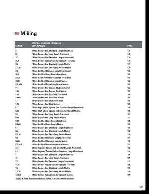 Milling GENERAL PURPOSE END MILLS SERIES DESCRIPTION PAGE 3 2 Flute Square End Standard Length Fractional 176 3L 2 Flute Square End Long Reach Fractional 176 3EL 2 Flute Square End Extended Length Fractional 176 3CR 2 Flute Corner Radius Standard Length Fractional 176 3M 2 Flute Square End Standard Length Metric 179 3XLM 2 Flute Square End Extra Long Reach Metric 179 3B 2 Flute Ball End Standard Length Fractional 180 3LB 2 Flute Ball End Long Reach Fractional 180 3ELB 2 Flute Ball End Extended Length Fractional 180 3MB 2 Flute Ball End Standard Length Metric 182 3XLMB 2 Flute Ball End Extra Long Reach Metric 182 15 2 Flute Double End Square Stub Fractional 183 15M 2 Flute Double End Square Stub Metric 183 15B 2 Flute Double End Ball Stub Fractional 184 15MB 2 Flute Double End Ball Stub Metric 184 17 2 Flute Square End Stub Fractional 185 17M 2 Flute Square End Stub Metric 185 52 2 Flute High Shear Square End Standard Length Fractional 186 52M 2 Flute High Shear Square End Standard Length Metric 186 59 2 Flute Square End Long Reach Fractional 187 59M 2 Flute Square End Long Reach Metric 187 59B 2 Flute Ball End Long Reach Fractional 188 59MB 2 Flute Ball End Long Reach Metric 188 5 3 Flute Square End Standard Length Fractional 189 5M 3 Flute Square End Standard Length Metric 190 5XLM 3 Flute Square End Extra Long Reach Metric 190 5B 3 Flute Ball End Standard Length Fractional 191 5MB 3 Flute Ball End Standard Length Metric 192 5XLMB 3 Flute Ball End Extra Long Reach Metric 192 23 3 Flute Tapered Square End Standard Length Fractional 193 24 3 Flute Tapered Corner Radius Standard Length Fractional 194 1 4 Flute Square End Standard Length Fractional 195 1L 4 Flute Square End Long Reach Fractional 195 1EL 4 Flute Square End Extended Length Fractional 195 1CR 4 Flute Corner Radius Standard Length Fractional 195 1M 4 Flute Square End Standard Length Metric 199 1XLM 4 Flute Square End Extra Long Reach Metric 199 1MCR 4 Flute Corner Radius Standard Length Metric 199 Speed & Feed Recommendations listed at the end of this section 169