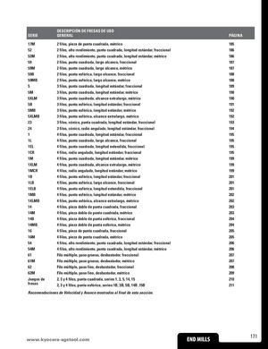 DESCRIPCIÓN DE FRESAS DE USO SERIE GENERAL PÁGINA 17M 2 filos, pieza de punta cuadrada, métrico 185 52 2 filos, alto rendimiento, punta cuadrada, longitud estándar, fraccional 186 52M 2 filos, alto rendimiento, punta cuadrada, longitud estándar, métrico 186 59 2 filos, punta cuadrada, largo alcance, fraccional 187 59M 2 filos, punta cuadrada, largo alcance, métrico 187 59B 2 filos, punta esférica, largo alcance, fraccional 188 59MB 2 filos, punta esférica, largo alcance, métrico 188 5 3 filos, punta cuadrada, longitud estándar, fraccional 189 5M 3 filos, punta cuadrada, longitud estándar, métrico 190 5XLM 3 filos, punta cuadrada, alcance extralargo, métrico 190 5B 3 filos, punta esférica, longitud estándar, fraccional 191 5MB 3 filos, punta esférica, longitud estándar, métrico 192 5XLMB 3 filos, punta esférica, alcance extralargo, métrico 192 23 3 filos, cónico, punta cuadrada, longitud estándar, fraccional 193 24 3 filos, cónico, radio angulado, longitud estándar, fraccional 194 1 4 filos, punta cuadrada, longitud estándar, fraccional 195 1L 4 filos, punta cuadrada, largo alcance, fraccional 195 1EL 4 filos, punta cuadrada, longitud extendida, fraccional 195 1CR 4 filos, radio angulado, longitud estándar, fraccional 195 1M 4 filos, punta cuadrada, longitud estándar, métrico 199 1XLM 4 filos, punta cuadrada, alcance extralargo, métrico 199 1MCR 4 filos, radio angulado, longitud estándar, métrico 199 1B 4 filos, punta esférica, longitud estándar, fraccional 201 1LB 4 filos, punta esférica, largo alcance, fraccional 201 1ELB 4 filos, punta esférica, longitud extendida, fraccional 201 1MB 4 filos, punta esférica, longitud estándar, métrico 202 1XLMB 4 filos, punta esférica, alcance extralargo, métrico 202 14 4 filos, pieza doble de punta cuadrada, fraccional 203 14M 4 filos, pieza doble de punta cuadrada, métrico 203 14B 4 filos, pieza doble de punta esférica, fraccional 204 14MB 4 filos, pieza doble de punta esférica, métrico 204 16 4 filos, pieza de punta cuadrada, fraccional 205 16M 4 filos, pieza de punta cuadrada, métrico 205 54 4 filos, alto rendimiento, punta cuadrada, longitud estándar, fraccional 206 54M 4 filos, alto rendimiento, punta cuadrada, longitud estándar, métrico 206 61 Filo múltiple, paso grueso, desbastador, fraccional 207 61M Filo múltiple, paso grueso, desbastador, métrico 207 62 Filo múltiple, paso fino, desbastador, fraccional 208 62M Filo múltiple, paso fino, desbastador, métrico 209 Juegos de 2, 3 y 4 filos, punta cuadrada, series 1, 3, 5, 14, 15 210 fresas 2, 3 y 4 filos, punta esférica, series 1B, 3B, 5B, 14B ,15B 211 Recomendaciones de Velocidad y Avance mostrados al final de esta sección. www.kyocera-sEgNsDtoMoIl.LcLoSm END MILLS 171