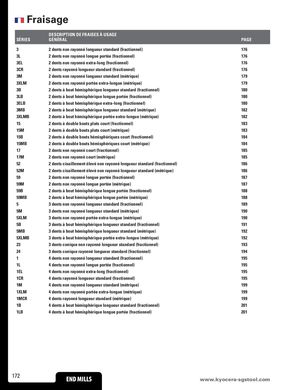 Fraisage DESCRIPTION DE FRAISES À USAGE SÈRIES GÉNÉRAL PAGE 3 2 dents non rayonné longueur standard (fractionnel) 176 3L 2 dents non rayonné longue portée (fractionnel) 176 3EL 2 dents non rayonné extra-long (fractionnel) 176 3CR 2 dents rayonné longueur standard (fractionnel) 176 3M 2 dents non rayonné longueur standard (métrique) 179 3XLM 2 dents non rayonné portée extra-longue (métrique) 179 3B 2 dents à bout hémisphérique longueur standard (fractionnel) 180 3LB 2 dents à bout hémisphérique longue portée (fractionnel) 180 3ELB 2 dents à bout hémisphérique extra-long (fractionnel) 180 3MB 2 dents à bout hémisphérique longueur standard (métrique) 182 3XLMB 2 dents à bout hémisphérique portée extra-longue (métrique) 182 15 2 dents à double bouts plats court (fractionnel) 183 15M 2 dents à double bouts plats court (métrique) 183 15B 2 dents à double bouts hémisphériques court (fractionnel) 184 15MB 2 dents à double bouts hémisphériques court (métrique) 184 17 2 dents non rayonné court (fractionnel) 185 17M 2 dents non rayonné court (métrique) 185 52 2 dents cisaillement élevé non rayonné longueur standard (fractionnel) 186 52M 2 dents cisaillement élevé non rayonné longueur standard (métrique) 186 59 2 dents non rayonné longue portée (fractionnel) 187 59M 2 dents non rayonné longue portée (métrique) 187 59B 2 dents à bout hémisphérique longue portée (fractionnel) 188 59MB 2 dents à bout hémisphérique longue portée (métrique) 188 5 3 dents non rayonné longueur standard (fractionnel) 189 5M 3 dents non rayonné longueur standard (métrique) 190 5XLM 3 dents non rayonné portée extra-longue (métrique) 190 5B 3 dents à bout hémisphérique longueur standard (fractionnel) 191 5MB 3 dents à bout hémisphérique longueur standard (métrique) 192 5XLMB 3 dents à bout hémisphérique portée extra-longue (métrique) 192 23 3 dents conique non rayonné longueur standard (fractionnel) 193 24 3 dents conique rayonné longueur standard (fractionnel) 194 1 4 dents non rayonné longueur standard (fractionnel) 195 1L 4 dents non rayonné longue portée (fractionnel) 195 1EL 4 dents non rayonné extra-long (fractionnel) 195 1CR 4 dents rayonné longueur standard (fractionnel) 195 1M 4 dents non rayonné longueur standard (métrique) 199 1XLM 4 dents non rayonné portée extra-longue (métrique) 199 1MCR 4 dents rayonné longueur standard (métrique) 199 1B 4 dents à bout hémisphérique longueur standard (fractionnel) 201 1LB 4 dents à bout hémisphérique longue portée (fractionnel) 201 172 END MILLS wwENwD.kMyIoLcLSera-sgstool.com