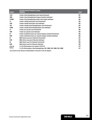 DESCRIPTION DE FRAISES À USAGE SÈRIES GÉNÉRAL PAGE 1ELB 4 dents à bout hémisphérique extra-long (fractionnel) 201 1MB 4 dents à bout hémisphérique longueur standard (métrique) 202 1XLMB 4 dents à bout hémisphérique portée extra-longue (métrique) 202 14 4 dents à double bouts plats court (fractionnel) 203 14M 4 dents à double bouts plats court (métrique) 203 14B 4 dents à double bouts hémisphériques court (fractionnel) 204 14MB 4 dents à double bouts hémisphériques court (métrique) 204 16 4 dents non rayonné court (fractionnel) 205 16M 4 dents non rayonné court (métrique) 205 54 4 dents cisaillement élevé non rayonné longueur standard (fractionnel) 206 54M 4 dents cisaillement élevé non rayonné longueur standard (métrique) 206 61 Multi-dents à pas gros d'ébauche (fractionnel) 207 61M Multi-dents à pas gros d'ébauche (métrique) 207 62 Multi-dents à pas fin d'ébauche (fractionnel) 208 62M Multi-dents à pas fin d'ébauche (métrique) 209 Jeux de 2, 3, & 4 Série goujure non rayonné 1,3,5,14,15 210 fraises 2, 3, & 4 Série goujure à bout hémisphérique 15B, 15MB, 15B, 15MB ,15B, 15MB 211 Les avances et les vitesses recommandées se trouvent à la fin du chapitre. www.kyocera-sEgNsDtoMoIl.LcLoSm END MILLS 173