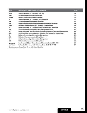 SERIE BESCHREIBUNG DER STANDARD-SCHAFTFRÄSER SEITE 1ELB Zölliger Schaftfräser mit 4 Schneiden, Extra lang 201 1MB Schaftfräser mit 4 Schneiden, Standardlänge 202 1XLMB Langloch-Radiusschaftfräser mit 4 Schneiden 202 14 Zölliger Schaftfräser mit 4 Schneiden, kurze Ausführung 203 14M Schaftfräser mit 4 Schneiden, kurze Ausführung 203 14B Zölliger Doppelend-Radiusschaftfräser mit 4 Schneiden, kurze Ausführung 204 14MB Doppelend-Radiusschaftfräser mit 4 Schneiden, kurze Ausführung 204 16 Zölliger Schaftfräser mit 4 Schneiden ohne Eckenradien, kurze Ausführung 205 16M Schaftfräser mit 4 Schneiden ohne Eckenradien, kurze Ausführung 205 54 Zölliger Schaftfräser hoher Scherfestigkeit mit 4 Schneiden ohne Eckenradien, Standardlänge 206 54M Schaftfräser hoher Scherfestigkeit mit 4 Schneiden ohne Eckenradien, Standardlänge 206 61 Zölliger mehrschneidiger fein verzahnter Schruppfräser 207 61M Mehrschneidiger fein verzahnter Schruppfräser 207 62 Zölliger mehrschneidiger fein verzahnter Schruppfräser 208 62M Mehrschneidiger fein verzahnter Schruppfräser 209 Richtwerte Schaftfräser mit 2, 3 und 4 Schneiden ohne Eckenradien, Serien 1, 3, 5, 14, 15 210 zum Fräsen Radiusschaftfräser mit 2, 3 und 4 Schneiden, Serien 1B, 3B, 5B, 14B ,15B 211 Schnittwertempfehlungen finden Sie am Ende dieses Abschnitts www.kyocera-sEgNsDtoMoIl.LcLoSm END MILLS 175