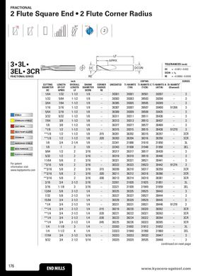 FRACTIONAL 2 Flute Square End • 2 Flute Corner Radius 30° POS 2 LF APMX 3 • 3L • TOLERANCES (inch) 3EL • 3CR DC DCON DC = –0.001/–0.002DCON=h6 FRACTIONAL SERIES RE RE = +0.0000/–0.0020 inch EDP NO. SERIES CUTTING LENGTH OVERALL SHANK CORNER UNCOATED Ti-NAMITE Ti-NAMITE-C Ti-NAMITE-A Di-NAMITE® DIAMETER OF CUT LENGTH DIAMETER RADIUS (TiN) (TiCN) (AlTiN) (Diamond) DC APMX LF DCON RE 1/64 1/32 1-1/2 1/8 – 30301 39301 39501 30397 – 3 1/32 5/64 1-1/2 1/8 – 30303 39303 39503 30398 – 3 3/64 7/64 1-1/2 1/8 – 30305 39305 39505 30399 – 3 1/16 3/16 1-1/2 1/8 – 30307 39307 39507 30400 91266 3 5/64 3/16 1-1/2 1/8 – 30309 39309 39509 30435 – 3 STEELS 3/32 9/32 1-1/2 1/8 – 30311 39311 39511 30436 – 3 STAINLESS STEELS 7/64 3/8 1-1/2 1/8 – 30313 39313 39513 30437 – 3 CAST IRON 1/8 3/8 1-1/2 1/8 – 30377 39377 39577 30469 – 3 *1/8 1/2 1-1/2 1/8 – 30315 39315 39515 30438 91270 3 HIGH TEMP ALLOYS **1/8 1/2 1-1/2 1/8 .015 38201 38202 38315 38357 – 3CR TITANIUM **1/8 1/2 1-1/2 1/8 .020 38203 38204 38316 38358 – 3CR HARDENED STEELS 1/8 3/4 2-1/4 1/8 – 33341 31800 31810 31850 – 3L 1/8 1 3 1/8 – 33343 31938 31948 31958 – 3EL NON-FERROUS 9/64 1/2 2 3/16 – 30317 39317 39517 30439 – 3 PLASTICS/COMPOSITES 5/32 1/2 2 3/16 – 30319 39319 39519 30440 – 3 11/64 5/8 2 3/16 – 30321 39321 39521 30441 – 3 For patent *3/16 5/8 2 3/16 – 30323 39323 39523 30442 91274 3 information visit www.ksptpatents.com **3/16 5/8 2 3/16 .015 38209 38210 38317 38359 – 3CR **3/16 5/8 2 3/16 .020 38211 38212 38318 38360 – 3CR **3/16 5/8 2 3/16 .030 38213 38214 38319 38361 – 3CR 3/16 3/4 2-1/2 3/16 – 33301 31820 31825 31851 – 3L 3/16 1-1/8 3 3/16 – 33321 31939 31949 31959 – 3EL 13/64 5/8 2-1/2 1/4 – 30325 39325 39525 30443 – 3 7/32 5/8 2-1/2 1/4 – 30327 39327 39527 30444 – 3 15/64 3/4 2-1/2 1/4 – 30329 39329 39529 30445 – 3 *1/4 3/4 2-1/2 1/4 – 30331 39331 39531 30446 91278 3 **1/4 3/4 2-1/2 1/4 .015 38219 38220 38320 38362 – 3CR **1/4 3/4 2-1/2 1/4 .020 38221 38222 38321 38363 – 3CR **1/4 3/4 2-1/2 1/4 .030 38223 38224 38322 38364 – 3CR **1/4 3/4 2-1/2 1/4 .045 38225 38226 38323 38365 – 3CR 1/4 1-1/8 3 1/4 – 33303 31802 31812 31852 – 3L 1/4 1-1/2 4 1/4 – 33323 31940 31950 31960 – 3EL 17/64 3/4 2-1/2 5/16 – 30333 39333 39533 30447 – 3 9/32 3/4 2-1/2 5/16 – 30335 39335 39535 30448 – 3 continued on next page 176 END MILLS wwENwD.kMyIoLcLSera-sgstool.com
