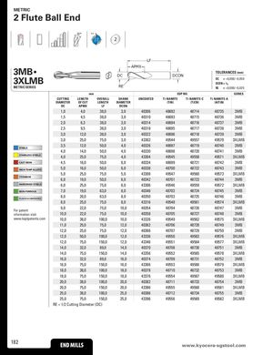 METRIC 2 Flute Ball End 30° POS 2 LF APMX 3MB • TOLERANCES (mm)DCDCON 3XLMB METRIC SERIES RE DC = +0,000/–0,050DCON = h6RE= +0,000/–0,025 mm EDP NO. SERIES CUTTING LENGTH OVERALL SHANK UNCOATED Ti-NAMITE Ti-NAMITE-C Ti-NAMITE-A DIAMETER OF CUT LENGTH DIAMETER (TiN) (TiCN) (AlTiN) DC APMX LF DCON 1,0 4,0 38,0 3,0 40306 48692 48714 48735 3MB 1,5 4,5 38,0 3,0 40310 48693 48715 48736 3MB 2,0 6,3 38,0 3,0 40314 48694 48716 48737 3MB 2,5 9,5 38,0 3,0 40318 48695 48717 48738 3MB 3,0 12,0 38,0 3,0 40322 48696 48718 48739 3MB 3,0 25,0 75,0 3,0 43302 49544 49557 49570 3XLMB 3,5 12,0 50,0 4,0 40326 48697 48719 48740 3MB STEELS 4,0 14,0 50,0 4,0 40330 48698 48720 48741 3MB STAINLESS STEELS 4,0 25,0 75,0 4,0 43304 49545 49558 49571 3XLMB CAST IRON 4,5 16,0 50,0 6,0 40334 48699 48721 48742 3MB HIGH TEMP ALLOYS 5,0 16,0 50,0 6,0 40338 48700 48722 48743 3MB 5,0 25,0 75,0 5,0 43308 49547 49560 49573 3XLMB TITANIUM 6,0 19,0 50,0 6,0 40342 48701 48723 48744 3MB HARDENED STEELS 6,0 25,0 75,0 6,0 43306 49546 49559 49572 3XLMB NON-FERROUS 7,0 19,0 63,0 8,0 40346 48702 48724 48745 3MB 8,0 20,0 63,0 8,0 40350 48703 48725 48746 3MB PLASTICS/COMPOSITES 8,0 25,0 75,0 8,0 43316 49548 49561 49574 3XLMB For patent 9,0 22,0 75,0 10,0 40354 48704 48726 48747 3MB information visit 10,0 22,0 75,0 10,0 40358 48705 48727 48748 3MB www.ksptpatents.com 10,0 38,0 100,0 10,0 43326 49549 49562 49575 3XLMB 11,0 25,0 75,0 12,0 40362 48706 48728 48749 3MB 12,0 25,0 75,0 12,0 40366 48707 48729 48750 3MB 12,0 50,0 100,0 12,0 43336 49550 49563 49576 3XLMB 12,0 75,0 150,0 12,0 43346 49551 49564 49577 3XLMB 14,0 32,0 89,0 14,0 40370 48708 48730 48751 3MB 14,0 75,0 150,0 14,0 43356 49552 49565 49578 3XLMB 16,0 32,0 89,0 16,0 40374 48709 48731 48752 3MB 16,0 75,0 150,0 16,0 43366 49553 49566 49579 3XLMB 18,0 38,0 100,0 18,0 40378 48710 48732 48753 3MB 18,0 75,0 150,0 18,0 43376 49554 49567 49580 3XLMB 20,0 38,0 100,0 20,0 40382 48711 48733 48754 3MB 20,0 75,0 150,0 20,0 43386 49555 49568 49581 3XLMB 25,0 38,0 100,0 25,0 40386 48712 48734 48755 3MB 25,0 75,0 150,0 25,0 43396 49556 49569 49582 3XLMB RE = 1/2 Cutting Diameter (DC) 182 END MILLS wwENwD.kMyIoLcLSera-sgstool.com