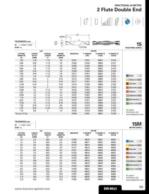 FRACTIONAL & METRIC 2 Flute Double End 30° POS 2 LF APMX TOLERANCES (inch) DCDC= +0.0000/–0.0020 15 DCON = h6 DCON FRACTIONAL SERIES inch EDP NO. CUTTING LENGTH OVERALL SHANK UNCOATED Ti-NAMITE Ti-NAMITE-C Ti-NAMITE-A DIAMETER OF CUT LENGTH DIAMETER (TiN) (TiCN) (AlTiN) DC APMX LF DCON 1/32 1/16 1-1/2 1/8 31501 31541 39651 31316 3/64 3/32 1-1/2 1/8 31503 31543 39653 31317 1/16 1/8 1-1/2 1/8 31505 31545 39655 31318 5/64 1/8 1-1/2 1/8 31507 31547 39657 31319 3/32 3/16 1-1/2 1/8 31509 31549 39659 31320 7/64 3/16 1-1/2 1/8 31511 31551 39661 31321 *1/8 1/4 1-1/2 1/8 31513 31553 39663 31322 STEELS 9/64 5/16 2 3/16 31515 31555 39665 31323 STAINLESS STEELS 5/32 5/16 2 3/16 31517 31557 39667 31324 11/64 5/16 2 3/16 31519 31559 39669 31325 CAST IRON *3/16 3/8 2 3/16 31521 31561 39671 31326 HIGH TEMP ALLOYS 13/64 1/2 2-1/2 1/4 31523 31563 39673 31327 7/32 1/2 2-1/2 1/4 31525 31565 39675 31328 TITANIUM 15/64 1/2 2-1/2 1/4 31527 31567 39677 31329 HARDENED STEELS *1/4 1/2 2-1/2 1/4 31529 31569 39679 31330 9/32 1/2 2-1/2 5/16 31531 31571 39681 31331 NON-FERROUS *5/16 1/2 2-1/2 5/16 31533 31573 39683 31332 PLASTICS/COMPOSITES *3/8 9/16 2-1/2 3/8 31535 31575 39685 31333 7/16 9/16 2-3/4 7/16 31537 31577 39687 31334 *1/2 5/8 3 1/2 31539 31579 39689 31335 For patent *Series 15 Set 31589 31581 39691 31336 information visitwww.ksptpatents.com TOLERANCES (mm)DC= +0,000/–0,050 15M DCON = h6 METRIC SERIES mm EDP NO. CUTTING LENGTH OVERALL SHANK UNCOATED Ti-NAMITE Ti-NAMITE-C Ti-NAMITE-A DIAMETER OF CUT LENGTH DIAMETER (TiN) (TiCN) (AlTiN) DC APMX LF DCON 1,0 2,0 38,0 3,0 41505 49010 49031 49052 1,5 3,0 38,0 3,0 41509 49011 49032 49053 STEELS 2,0 4,0 38,0 3,0 41513 49012 49033 49054 STAINLESS STEELS 2,5 5,0 38,0 3,0 41517 49013 49034 49055 3,0 6,0 38,0 3,0 41521 49014 49035 49056 CAST IRON 3,5 7,0 50,0 4,0 41525 49015 49036 49057 HIGH TEMP ALLOYS 4,0 8,0 50,0 4,0 41529 49016 49037 49058 4,5 9,5 63,0 4,5 41533 49017 49038 49059 TITANIUM 5,0 10,0 63,0 5,0 41537 49018 49039 49060 HARDENED STEELS 6,0 12,0 63,0 6,0 41541 49019 49040 49061 7,0 12,0 63,0 8,0 41545 49020 49041 49062 NON-FERROUS 8,0 12,0 63,0 8,0 41549 49021 49042 49063 PLASTICS/COMPOSITES 9,0 14,0 75,0 9,0 41553 49022 49043 49064 10,0 14,0 75,0 10,0 41557 49023 49044 4906511,014,075,012,041561490244904549066For patentinformation visit 12,0 16,0 75,0 12,0 41565 49025 49046 49067 www.ksptpatents.com www.kyocera-sEgNsDtoMoIl.LcLoSm END MILLS 183