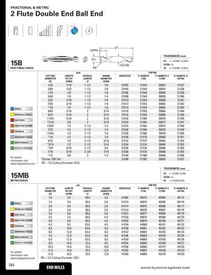 FRACTIONAL & METRIC 2 Flute Double End Ball End 30° POS 2 LF APMX TOLERANCES (inch) 15B DC DC = –0.0000/–0.0020DCONDCON = h6 FRACTIONAL SERIES RE RE = +0.0000/–0.0010 inch EDP NO. CUTTING LENGTH OVERALL SHANK UNCOATED Ti-NAMITE Ti-NAMITE-C Ti-NAMITE-A DIAMETER OF CUT LENGTH DIAMETER (TiN) (TiCN) (AlTiN) DC APMX LF DCON 1/32 1/16 1-1/2 1/8 31502 31542 39652 31337 3/64 3/32 1-1/2 1/8 31504 31544 39654 31338 1/16 1/8 1-1/2 1/8 31506 31546 39656 31339 5/64 1/8 1-1/2 1/8 31508 31548 39658 31340 3/32 3/16 1-1/2 1/8 31510 31550 39660 31341 7/64 3/16 1-1/2 1/8 31512 31552 39662 31342 STEELS *1/8 1/4 1-1/2 1/8 31514 31554 39664 31343 9/64 5/16 2 3/16 31516 31556 39666 31344 STAINLESS STEELS 5/32 5/16 2 3/16 31518 31558 39668 31345 11/64 5/16 2 3/16 31520 31560 39670 31346 CAST IRON *3/16 3/8 2 3/16 31522 31562 39672 31347 HIGH TEMP ALLOYS 13/64 1/2 2-1/2 1/4 31524 31564 39674 31348 7/32 1/2 2-1/2 1/4 31526 31566 39676 31349 TITANIUM 15/64 1/2 2-1/2 1/4 31528 31568 39678 31350 HARDENED STEELS *1/4 1/2 2-1/2 1/4 31530 31570 39680 31351 9/32 1/2 2-1/2 5/16 31532 31572 39682 31352 NON-FERROUS *5/16 1/2 2-1/2 5/16 31534 31574 39684 31353 PLASTICS/COMPOSITES *3/8 9/16 2-1/2 3/8 31536 31576 39686 31354 7/16 9/16 2-3/4 7/16 31538 31578 39688 31355 For patentinformation visit *1/2 5/8*Series 15B Set 3 1/2 31540 31580 39690 3135631590315823969231357 www.ksptpatents.com RE = 1/2 Cutting Diameter (DC) TOLERANCES (mm) 15MB DC = +0,000/–0,050DCON = h6 METRIC SERIES RE = +0,000/0,025 mm EDP NO. CUTTING LENGTH OVERALL SHANK UNCOATED Ti-NAMITE Ti-NAMITE-C Ti-NAMITE-A DIAMETER OF CUT LENGTH DIAMETER (TiN) (TiCN) (AlTiN) DC APMX LF DCON 1,0 2,0 38,0 3,0 41506 49073 49094 49115 1,5 3,0 38,0 3,0 41510 49074 49095 49116 STEELS 2,0 4,0 38,0 3,0 41514 49075 49096 49117 STAINLESS STEELS 2,5 5,0 38,0 3,0 41518 49076 49097 49118 CAST IRON 3,0 6,0 38,0 3,0 41522 49077 49098 49119 3,5 7,0 50,0 4,0 41526 49078 49099 49120 HIGH TEMP ALLOYS 4,0 8,0 50,0 4,0 41530 49079 49100 49121 TITANIUM 4,5 9,5 63,0 4,5 41534 49080 49101 49122 5,0 10,0 63,0 5,0 41538 49081 49102 49123 HARDENED STEELS 6,0 12,0 63,0 6,0 41542 49082 49103 49124 7,0 12,0 63,0 8,0 41546 49083 49104 49125 NON-FERROUS 8,0 12,0 63,0 8,0 41550 49084 49105 49126 PLASTICS/COMPOSITES 9,0 14,0 75,0 9,0 41554 49085 49106 49127 10,0 14,0 75,0 10,0 41558 49086 49107 49128 For patentinformation visit 11,0 14,0 75,0 12,0 41562 49087 49108 4912912,016,075,012,041566490884910949130 www.ksptpatents.com RE = 1/2 Cutting Diameter (DC) 184 END MILLS wwENwD.kMyIoLcLSera-sgstool.com