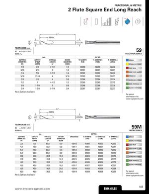 FRACTIONAL & METRIC 2 Flute Square End Long Reach 25° POS 2 LF APMX DC DCON TOLERANCES (mm)DC= +0,000/–0,050 59 DCON = h6 FRACTIONAL SERIES inch EDP NO. CUTTING LENGTH OVERALL SHANK Ti-NAMITE Ti-NAMITE-C Ti-NAMITE-A STEELS DIAMETER OF CUT LENGTH DIAMETER (TiN) (TiCN) (AlTiN) DC APMX LF DCON STAINLESS STEELS 1/8 3/8 2-1/2 1/4 32280 32260 32270 CAST IRON 3/16 9/16 3 1/4 32281 32261 32271 1/4 5/8 3-1/2 1/4 32282 32262 32272 HIGH TEMP ALLOYS 5/16 11/16 4 5/16 32283 32263 32273 TITANIUM 3/8 7/8 4 3/8 32284 32264 32274 HARDENED STEELS 1/2 1 4-1/2 1/2 32285 32265 32275 NON-FERROUS 5/8 1-1/8 5 5/8 32286 32266 32276 3/4 1-3/8 5-1/4 3/4 32287 32267 32277 PLASTICS/COMPOSITES Neck Option Available For patent information visit www.ksptpatents.com LF APMX DC DCON TOLERANCES (mm)DC= +0,000/–0,050 59M DCON = h6 METRIC SERIES mm EDP NO. CUTTING LENGTH OVERALL SHANK UNCOATED Ti-NAMITE Ti-NAMITE-C Ti-NAMITE-A STEELS DIAMETER OF CUT LENGTH DIAMETER (TiN) (TiCN) (AlTiN) DC APMX LF DCON STAINLESS STEELS 3,0 9,0 60,0 6,0 43910 43920 43930 43950 CAST IRON 4,0 12,0 70,0 6,0 43911 43921 43931 43951 6,0 15,0 80,0 6,0 43912 43922 43932 43952 HIGH TEMP ALLOYS 8,0 20,0 89,0 8,0 43913 43923 43933 43953 TITANIUM 10,0 25,0 100,0 10,0 43914 43924 43934 43954 HARDENED STEELS 12,0 30,0 110,0 12,0 43915 43925 43935 43955 NON-FERROUS 14,0 35,0 120,0 16,0 43916 43926 43936 43956 16,0 40,0 120,0 16,0 43917 43927 43937 43957 PLASTICS/COMPOSITES 18,0 40,0 130,0 20,0 43918 43928 43938 43958 20,0 45,0 130,0 20,0 43919 43929 43939 43959 For patent Neck Option Available information visitwww.ksptpatents.com www.kyocera-sEgNsDtoMoIl.LcLoSm END MILLS 187
