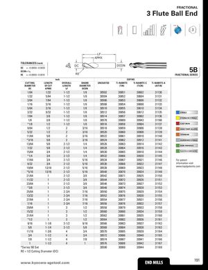 FRACTIONAL 3 Flute Ball End 30° POS 3 LF APMX TOLERANCES (inch) DC DCON DC = –0.0000/–0.0020DCON = h6 5B RE = +0.0000/–0.0010 RE FRACTIONAL SERIES inch EDP NO. CUTTING LENGTH OVERALL SHANK UNCOATED Ti-NAMITE Ti-NAMITE-C Ti-NAMITE-A DIAMETER OF CUT LENGTH DIAMETER (TiN) (TiCN) (AlTiN) DC APMX LF DCON 1/64 1/32 1-1/2 1/8 30502 30851 30602 31130 1/32 5/64 1-1/2 1/8 30504 30852 30604 31131 3/64 7/64 1-1/2 1/8 30506 30853 30606 31132 1/16 3/16 1-1/2 1/8 30508 30854 30608 31133 5/64 3/16 1-1/2 1/8 30510 30855 30610 31134 3/32 9/32 1-1/2 1/8 30512 30856 30612 31135 STEELS 7/64 3/8 1-1/2 1/8 30514 30857 30902 31136 STAINLESS STEELS 1/8 3/8 1-1/2 1/8 30578 30889 30943 31168 *1/8 1/2 1-1/2 1/8 30516 30858 30904 31137 CAST IRON 9/64 1/2 2 3/16 30518 30859 30906 31138 HIGH TEMP ALLOYS 5/32 1/2 2 3/16 30520 30860 30908 31139 11/64 5/8 2 3/16 30522 30861 30910 31140 TITANIUM *3/16 5/8 2 3/16 30524 30862 30912 31141 HARDENED STEELS 13/64 5/8 2-1/2 1/4 30526 30863 30914 31142 NON-FERROUS 7/32 5/8 2-1/2 1/4 30528 30864 30916 31143 15/64 3/4 2-1/2 1/4 30530 30865 30918 31144 PLASTICS/COMPOSITES *1/4 3/4 2-1/2 1/4 30532 30866 30920 31145 17/64 3/4 2-1/2 5/16 30534 30867 30921 31146 For patent 9/32 3/4 2-1/2 5/16 30536 30868 30922 31147 information visit 19/64 13/16 2-1/2 5/16 30538 30869 30923 31148 www.ksptpatents.com *5/16 13/16 2-1/2 5/16 30540 30870 30924 31149 21/64 1 2-1/2 3/8 30542 30871 30925 31150 11/32 1 2-1/2 3/8 30544 30872 30926 31151 23/64 1 2-1/2 3/8 30546 30873 30927 31152 *3/8 1 2-1/2 3/8 30548 30874 30928 31153 25/64 1 2-3/4 7/16 30550 30875 30929 31154 13/32 1 2-3/4 7/16 30552 30876 30930 31155 27/64 1 2-3/4 7/16 30554 30877 30931 31156 7/16 1 2-3/4 7/16 30556 30878 30932 31157 29/64 1 3 1/2 30558 30879 30933 31158 15/32 1 3 1/2 30560 30880 30934 31159 31/64 1 3 1/2 30562 30881 30935 31160 *1/2 1 3 1/2 30564 30882 30936 31161 9/16 1-1/8 3-1/2 9/16 30566 30883 30937 31162 5/8 1-1/4 3-1/2 5/8 30568 30884 30938 31163 11/16 1-3/8 4 3/4 30570 30885 30939 31164 3/4 1-1/2 4 3/4 30572 30886 30940 31165 7/8 1-1/2 4 7/8 30574 30887 30941 31166 1 1-1/2 4 1 30576 30888 30942 31167 *Series 5B Set 30590 30900 30944 31169 RE = 1/2 Cutting Diameter (DC) www.kyocera-sEgNsDtoMoIl.LcLoSm END MILLS 191