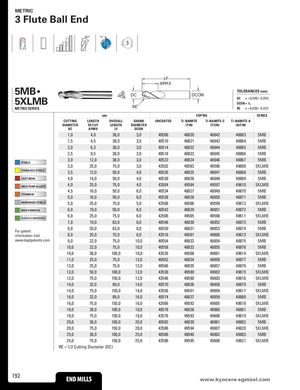 METRIC 3 Flute Ball End 30° POS 3 LF APMX 5MB • TOLERANCES (mm)DCDCON 5XLMB DC = +0,000/–0,050DCON = h6 METRIC SERIES RE RE = +0,000/–0,025 mm EDP NO. SERIES CUTTING LENGTH OVERALL SHANK UNCOATED Ti-NAMITE Ti-NAMITE-C Ti-NAMITE-A DIAMETER OF CUT LENGTH DIAMETER (TiN) (TiCN) (AlTiN) DC APMX LF DCON 1,0 4,0 38,0 3,0 40506 48820 48842 48863 5MB 1,5 4,5 38,0 3,0 40510 48821 48843 48864 5MB 2,0 6,3 38,0 3,0 40514 48822 48844 48865 5MB 2,5 9,5 38,0 3,0 40518 48823 48845 48866 5MB 3,0 12,0 38,0 3,0 40522 48824 48846 48867 5MB STEELS 3,0 25,0 75,0 3,0 43502 49583 49596 49609 5XLMB STAINLESS STEELS 3,5 12,0 50,0 4,0 40526 48825 48847 48868 5MB CAST IRON 4,0 14,0 50,0 4,0 40530 48826 48848 48869 5MB HIGH TEMP ALLOYS 4,0 25,0 75,0 4,0 43504 49584 49597 49610 5XLMB 4,5 16,0 50,0 6,0 40534 48827 48849 48870 5MB TITANIUM 5,0 16,0 50,0 6,0 40538 48828 48850 48871 5MB HARDENED STEELS 5,0 25,0 75,0 5,0 43508 49586 49599 49612 5XLMB NON-FERROUS 6,0 19,0 50,0 6,0 40542 48829 48851 48872 5MB 6,0 25,0 75,0 6,0 43506 49585 49598 49611 5XLMB PLASTICS/COMPOSITES 7,0 19,0 63,0 8,0 40546 48830 48852 48873 5MB For patent 8,0 20,0 63,0 8,0 40550 48831 48853 48874 5MB information visit 8,0 25,0 75,0 8,0 43516 49587 49600 49613 5XLMB www.ksptpatents.com 9,0 22,0 75,0 10,0 40554 48832 48854 48875 5MB 10,0 22,0 75,0 10,0 40558 48833 48855 48876 5MB 10,0 38,0 100,0 10,0 43526 49588 49601 49614 5XLMB 11,0 25,0 75,0 12,0 40562 48834 48856 48877 5MB 12,0 25,0 75,0 12,0 40566 48835 48857 48878 5MB 12,0 50,0 100,0 12,0 43536 49589 49602 49615 5XLMB 12,0 75,0 150,0 12,0 43546 49590 49603 49616 5XLMB 14,0 32,0 89,0 14,0 40570 48836 48858 48879 5MB 14,0 75,0 150,0 14,0 43556 49591 49604 49617 5XLMB 16,0 32,0 89,0 16,0 40574 48837 48859 48880 5MB 16,0 75,0 150,0 16,0 43566 49592 49605 49618 5XLMB 18,0 38,0 100,0 18,0 40578 48838 48860 48881 5MB 18,0 75,0 150,0 18,0 43576 49593 49606 49619 5XLMB 20,0 38,0 100,0 20,0 40582 48839 48861 48882 5MB 20,0 75,0 150,0 20,0 43586 49594 49607 49620 5XLMB 25,0 38,0 100,0 25,0 40586 48840 48862 48883 5MB 25,0 75,0 150,0 25,0 43596 49595 49608 49621 5XLMB RE = 1/2 Cutting Diameter (DC) 192 END MILLS wwENwD.kMyIoLcLSera-sgstool.com