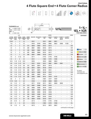 FRACTIONAL 4 Flute Square End • 4 Flute Corner Radius 30° POS 4 ≠ LF TOLERANCES (inch) APMXDC= +0.0000/–0.0020DCDCON 1 • 1L • 1CR DC = –0.0010/–0.0020DCON=h6 1EL • 1CR RE = +0.000/–0.002 RE FRACTIONAL SERIES inch EDP NO. SERIES CONTINUED CUTTING LENGTH OVERALL SHANK CORNER UNCOATED UNCOATED W/ Ti-NAMITE Ti-NAMITE-C Ti-NAMITE-A Ti-NAMITE-A Di-NAMITE® DIAMETER OF CUT LENGTH DIAMETER RADIUS FLAT (TiN) (TiCN) (AlTiN) (AlTiN) (Diamond) DC APMX LF DCON RE W/FLAT 31/64 1 3 1/2 – 30161 – 39161 39061 30021 – – 1 *1/2 1 3 1/2 – 30163 30180 39163 39063 30022 30380 91292 1 1/2 1 3 1/2 .015 38059 38060 38132 38174 – – – 1CR 1/2 1 3 1/2 .020 38061 38062 38133 38175 – – – 1CR 1/2 1 3 1/2 .030 38063 38064 38134 38176 – – – 1CR STEELS 1/2 1 3 1/2 .045 38065 38066 38135 38177 – – – 1CR STAINLESS STEELS 1/2 1 3 1/2 .060 38067 38068 38136 38178 – – – 1CR CAST IRON 1/2 2 4-1/2 1/2 – 33111 – 31733 31743 31766 – – 1L HIGH TEMP ALLOYS 1/2 3 6 1/2 – 33131 – 31866 31876 31886 – – 1EL TITANIUM 9/16 1-1/8 3-1/2 9/16 – 30165 – 39165 39065 30023 – – 1 HARDENED STEELS 5/8 1-1/4 3-1/2 5/8 – 30167 30181 39167 39067 30024 30381 – 1 NON-FERROUS 5/8 1-1/4 3-1/2 5/8 .015 38073 38074 38137 38179 – – – 1CR PLASTICS/COMPOSITES 5/8 1-1/4 3-1/2 5/8 .020 38075 38076 38138 38180 – – – 1CR 5/8 1-1/4 3-1/2 5/8 .030 38077 38078 38139 38181 – – – 1CR For patent 5/8 1-1/4 3-1/2 5/8 .045 38079 38080 38140 38182 – – – 1CR information visit www.ksptpatents.com 5/8 1-1/4 3-1/2 5/8 .060 38081 38082 38141 38183 – – – 1CR 5/8 1-1/4 3-1/2 5/8 .090 38083 38084 38142 38184 31767 – – 1L 5/8 3 6 5/8 – 33133 – 31867 31877 31887 – – 1EL 11/16 1-3/8 4 3/4 – 30169 – 39169 39069 30025 – – 1 3/4 1-1/2 4 3/4 – 30171 30182 39171 39071 30026 30382 – 1 3/4 1-1/2 4 3/4 .015 38087 38088 38143 38185 – – – 1CR 3/4 1-1/2 4 3/4 .020 38089 38090 38144 38186 – – – 1CR 3/4 1-1/2 4 3/4 .030 38091 38092 38145 38187 – – – 1CR 3/4 1-1/2 4 3/4 .045 38093 38094 38146 38188 – – – 1CR 3/4 1-1/2 4 3/4 .060 38095 38096 38147 38189 – – – 1CR 3/4 1-1/2 4 3/4 .090 38097 38098 38148 38190 – – – 1CR 3/4 1-1/2 4 3/4 .125 38099 38100 38149 38191 – – – 1CR 3/4 2-1/4 5 3/4 – 33115 – 31735 31745 31768 – – 1L 3/4 3 6 3/4 – 33135 – 31868 31878 31888 – – 1EL 7/8 1-1/2 4 7/8 – 30173 – 39173 39073 30027 – – 1 continued on next page www.kyocera-sEgNsDtoMoIl.LcLoSm END MILLS 197
