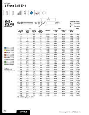 METRIC 4 Flute Ball End 30° POS 4 ≠ LF APMX 1MB • TOLERANCES (mm) 1XLMB DC DCON DC = +0,000/–0,050DCON = h6 METRIC SERIES RE RE = +0,000/–0,025 mm EDP NO. SERIES CUTTING LENGTH OVERALL SHANK UNCOATED Ti-NAMITE Ti-NAMITE-C Ti-NAMITE-A DIAMETER OF CUT LENGTH DIAMETER (TiN) (TiCN) (AlTiN) DC APMX LF DCON 1,0 4,0 38,0 3,0 40106 48564 48586 48607 1MB 1,5 4,5 38,0 3,0 40110 48565 48587 48608 1MB 2,0 6,3 38,0 3,0 40114 48566 48588 48609 1MB 2,5 9,5 38,0 3,0 40118 48567 48589 48610 1MB 3,0 12,0 38,0 3,0 40122 48568 48590 48611 1MB 3,0 25,0 75,0 3,0 43102 49505 49518 49531 1XLMB 3,5 12,0 50,0 4,0 40126 48569 48591 48612 1MB STEELS 4,0 14,0 50,0 4,0 40130 48570 48592 48613 1MB 4,0 25,0 75,0 4,0 43104 49506 49519 49532 1XLMB STAINLESS STEELS 4,5 16,0 50,0 6,0 40134 48571 48593 48614 1MB CAST IRON 5,0 16,0 50,0 6,0 40138 48572 48594 48615 1MB HIGH TEMP ALLOYS 5,0 25,0 75,0 5,0 43108 49508 49521 49534 1XLMB 6,0 19,0 50,0 6,0 40142 48573 48595 48616 1MB TITANIUM 6,0 25,0 75,0 6,0 43106 49507 49520 49533 1XLMB HARDENED STEELS 7,0 19,0 63,0 8,0 40146 48574 48596 48617 1MB NON-FERROUS 8,0 20,0 63,0 8,0 40150 48575 48597 48618 1MB PLASTICS/COMPOSITES 8,0 25,0 75,0 8,0 43116 49509 49522 49535 1XLMB 9,0 22,0 75,0 10,0 40154 48576 48598 48619 1MB For patent 10,0 22,0 75,0 10,0 40158 48577 48599 48620 1MB information visit 10,0 38,0 100,0 10,0 43126 49510 49523 49536 1XLMB www.ksptpatents.com 11,0 25,0 75,0 12,0 40162 48578 48600 48621 1MB 12,0 25,0 75,0 12,0 40166 48579 48601 48622 1MB 12,0 50,0 100,0 12,0 43136 49511 49524 49537 1XLMB 12,0 75,0 150,0 12,0 43146 49512 49525 49538 1XLMB 14,0 32,0 89,0 14,0 40170 48580 48602 48623 1MB 14,0 75,0 150,0 14,0 43156 49513 49526 49539 1XLMB 16,0 32,0 89,0 16,0 40174 48581 48603 48624 1MB 16,0 75,0 150,0 16,0 43166 49514 49527 49540 1XLMB 18,0 38,0 100,0 18,0 40178 48582 48604 48625 1MB 18,0 75,0 150,0 18,0 43176 49515 49528 49541 1XLMB 20,0 38,0 100,0 20,0 40182 48583 48605 48626 1MB 20,0 75,0 150,0 20,0 43186 49516 49529 49542 1XLMB 25,0 38,0 100,0 25,0 40186 48584 48606 48627 1MB 25,0 75,0 150,0 25,0 43196 49517 49530 49543 1XLMB RE = 1/2 Cutting Diameter (DC) 202 END MILLS wwENwD.kMyIoLcLSera-sgstool.com