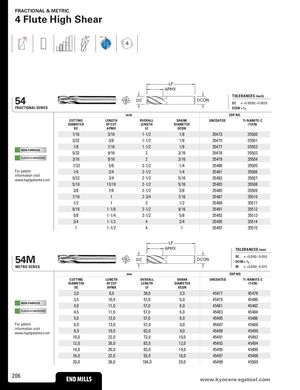 FRACTIONAL & METRIC 4 Flute High Shear 30° POS 4 LF APMX 54 TOLERANCES (inch)DCDCONDC= +0.0000/–0.0020 FRACTIONAL SERIES DCON = h6 inch EDP NO. CUTTING LENGTH OVERALL SHANK UNCOATED Ti-NAMITE-C DIAMETER OF CUT LENGTH DIAMETER (TiCN) DC APMX LF DCON 1/16 3/16 1-1/2 1/8 35473 35500 3/32 3/8 1-1/2 1/8 35475 35501 1/8 7/16 1-1/2 1/8 35477 35502 NON-FERROUS 5/32 9/16 2 3/16 35478 35503 PLASTICS/COMPOSITES 3/16 9/16 2 3/16 35479 35504 7/32 5/8 2-1/2 1/4 35480 35505 For patent 1/4 3/4 2-1/2 1/4 35481 35506 information visitwww.ksptpatents.com 9/32 3/4 2-1/2 5/16 35482 35507 5/16 13/16 2-1/2 5/16 35483 35508 3/8 7/8 2-1/2 3/8 35485 35509 7/16 1 2-3/4 7/16 35487 35510 1/2 1 3 1/2 35489 35511 9/16 1-1/8 3-1/2 9/16 35491 35512 5/8 1-1/4 3-1/2 5/8 35493 35513 3/4 1-1/2 4 3/4 35495 35514 1 1-1/2 4 1 35497 35515 LF APMX TOLERANCES (mm) 54M DC = +0,000/–0,050DCDCONDCON = h6 METRIC SERIES RE = +0,000/–0,025 mm EDP NO. CUTTING LENGTH OVERALL SHANK UNCOATED Ti-NAMITE-C DIAMETER OF CUT LENGTH DIAMETER (TiCN) DC APMX LF DCON 3,0 8,0 38,0 3,0 45477 45478 3,5 10,0 57,0 6,0 45479 45480 NON-FERROUS 4,0 11,0 57,0 6,0 45481 45482 PLASTICS/COMPOSITES 4,5 11,0 57,0 6,0 45483 45484 5,0 13,0 57,0 6,0 45485 45486 For patent 6,0 13,0 57,0 6,0 45487 45488 information visitwww.ksptpatents.com 8,0 19,0 63,0 8,0 45489 45490 10,0 22,0 72,0 10,0 45491 45492 12,0 26,0 83,0 12,0 45493 45494 14,0 26,0 83,0 14,0 45495 45496 16,0 32,0 92,0 16,0 45497 45498 20,0 38,0 104,0 20,0 45499 45500 206 END MILLS wwENwD.kMyIoLcLSera-sgstool.com