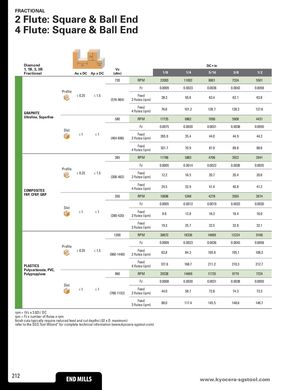 FRACTIONAL 2 Flute: Square & Ball End 4 Flute: Square & Ball End Ap Diamond Ae Ae DC • in 1, 1B, 3, 3B Vc Fractional Ae x DC Ap x DC (sfm) 1/8 1/4 5/16 3/8 1/2 720 RPM 22003 11002 8801 7334 5501 Fz 0.0009 0.0023 0.0036 0.0043 0.0058 Profile ≤ 0.25 ≤ 1.5 Feed(576-864)2 flutes (ipm)38.350.6 63.4 63.1 63.8 GRAPHITE Feed4 flutes (ipm)76.6 101.2 126.7 126.2 127.6 Ultrafine, Superfine 580 RPM 17725 8862 7090 5908 4431 Fz 0.0075 0.0020 0.0031 0.0038 0.0050 Slot ≤1 ≤1 Feed(464-696)2 flutes (ipm)265.935.4 44.0 44.9 44.3 Feed4 flutes (ipm)531.7 70.9 87.9 89.8 88.6 385 RPM 11766 5883 4706 3922 2941 Fz 0.0005 0.0014 0.0022 0.0026 0.0035 Profile ≤ 0.25 ≤ 1.5 Feed(308-462)2 flutes (ipm)12.216.5 20.7 20.4 20.6 COMPOSITES Feed4 flutes (ipm)24.5 32.9 41.4 40.8 41.2 FRP, CFRP, GRP 350 RPM 10696 5348 4278 3565 2674 Fz 0.0005 0.0012 0.0019 0.0023 0.0030 Slot ≤1 ≤1 Feed(280-420)2 flutes (ipm)9.6 12.8 16.3 16.4 16.0 Feed3 flutes (ipm)19.3 25.7 32.5 32.8 32.1 1200 RPM 36672 18336 14669 12224 9168 Fz 0.0009 0.0023 0.0036 0.0043 0.0058 Profile ≤ 0.25 ≤ 1.5 Feed(960-1440)2 flutes (ipm)63.884.3 105.6 105.1 106.3 PLASTICS Feed4 flutes (ipm)127.6 168.7 211.2 210.3 212.7 Polycarbonate, PVC, Polypropylene 960 RPM 29338 14669 11735 9779 7334 Fz 0.0008 0.0020 0.0031 0.0038 0.0050 Slot ≤1 ≤1 Feed(768-1152)2 flutes (ipm)44.058.7 72.8 74.3 73.3 Feed3 flutes (ipm)88.0 117.4 145.5 148.6 146.7 rpm = (Vc x 3.82) / DC ipm = Fz x number of flutes x rpm finish cuts typically require reduced feed and cut depths (.02 x D maximum) refer to the SGS Tool Wizard® for complete technical information (www.kyocera-sgstool.com) 212 END MILLS wwENwD.kMyIoLcLSera-sgstool.com