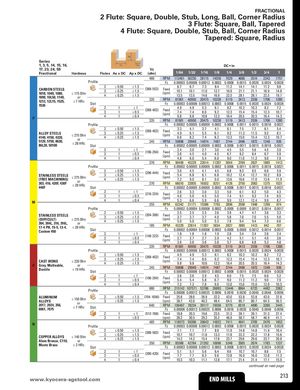 FRACTIONAL 2 Flute: Square, Double, Stub, Long, Ball, Corner Radius 3 Flute: Square, Ball, Tapered 4 Flute: Square, Double, Stub, Ball, Corner Radius Tapered: Square, Radius Ap Series 1, 3, 5, 14, 15, 16, Ae Ae DC • in 17, 23, 24, 59 Vc Fractional Hardness Flutes Ae x DC Ap x DC (sfm) 1/64 1/32 1/16 1/8 1/4 3/8 1/2 3/4 1 460 RPM 112461 56230 28115 14058 7029 4686 3514 2343 1757 Profile Fz 0.00003 0.00006 0.00013 0.0003 0.0008 0.0015 0.0020 0.0024 0.0028 CARBON STEELS1018, 1040, 1080,≤ 175 Bhn1090, 10L50, 1140,or2341212, 12L15, 1525,1536≤ 7 HRcSlot23P4≤ 0.50≤ 0.25≤ 0.25111≤ 1.5≤ 1.5≤ 1.5(368-552)Feed(ipm)6.710.113.56.710.113.57.311.014.68.412.716.911.216.922.514.121.128.114.121.128.111.216.922.59.814.819.7335RPM8190140950204751023851193413255917061280Fz0.00003 0.00006 0.000130.00030.00080.00150.00200.00240.0028≤1≤ 0.5≤ 0.4(268-402)Feed(ipm)4.97.49.84.95.36.18.210.210.28.27.27.48.09.212.315.415.412.310.79.810.612.316.420.520.516.414.3335RPM8190140950204751023851193413255917061280 Profile Fz 0.00002 0.00005 0.00009 0.0002 0.0006 0.0011 0.0015 0.0018 0.0021 ALLOY STEELS4140, 4150, 4320,5120, 5150, 8630,86L20, 501002≤ 275 Bhnor34≤ 28 HRcSlot≤ 0.50≤ 0.25≤ 0.25≤ 1.5≤ 1.5≤ 1.5(268-402)Feed(ipm)3.34.96.64.16.18.23.75.57.44.16.17.57.76.15.46.19.211.311.59.28.18.212.315.015.412.310.7245RPM59898299491497474873744249618721248936Fz0.00002 0.00005 0.000090.00020.00060.00110.00150.00180.0021 234 111 ≤1≤ 0.5≤ 0.4(196-294)Feed(ipm)2.43.64.83.04.56.02.74.05.43.04.56.04.55.5 5.6 4.56.78.28.46.79.011.011.29.03.95.97.9 370 RPM 90458 45229 22614 11307 5654 3769 2827 1885 1413 Profile Fz 0.00002 0.00005 0.00009 0.0002 0.0006 0.0011 0.0015 0.0018 0.0021 2STAINLESS STEELS(FREE MACHINING)303, 416, 420F, 430F440F≤ 275 Bhnor≤ 28 HRcSlot34≤ 0.50≤ 0.25≤ 0.25≤ 1.5≤ 1.5≤ 1.5(296-444)Feed(ipm)3.65.47.24.56.89.04.16.18.14.56.88.38.56.85.96.810.212.412.710.28.99.013.616.617.013.611.9270RPM660103300516502825141262750206313751031Fz0.00002 0.00005 0.000090.00020.00060.00110.00150.00180.0021 M 234 111 ≤1≤ 0.5≤ 0.4(216-324)Feed(ipm)2.64.05.33.35.06.63.04.55.93.35.06.65.06.1 6.2 5.07.49.19.37.49.912.112.49.94.36.58.7255RPM62342311711558677933896259819481299974 Profile Fz 0.00002 0.00004 0.00008 0.0002 0.0005 0.0009 0.0012 0.0014 0.0017 STAINLESS STEELS(DIFFICULT)≤ 275 Bhn304, 304L, 316, 316L,or23417-4 PH, 15-5, 13-4,Custom 450≤ 28 HRcSlot234≤ 0.50≤ 0.25≤ 0.25111≤ 1.5≤ 1.5≤ 1.5(204-306)Feed(ipm)2.53.75.02.53.75.02.53.75.02.64.05.33.95.87.84.77.09.44.77.09.43.65.57.33.35.06.6185RPM4522922614113075654282718851413942707Fz0.00002 0.00004 0.000080.00020.00050.00090.00120.00140.0017≤1≤ 0.5≤ 0.4(148-222)Feed(ipm)1.82.73.61.82.73.61.82.73.61.92.93.82.84.25.73.45.16.83.45.16.82.64.05.32.43.64.8 335 RPM 81901 40950 20475 10238 5119 3413 2559 1706 1280 Profile Fz 0.00003 0.00006 0.00013 0.0003 0.0008 0.0015 0.0020 0.0024 0.0028 2CAST IRONS≤ 220 BhnKGray, Malleable,or34Ductile≤ 19 HRcSlot≤ 0.50≤ 0.25≤ 0.25≤ 1.5≤ 1.5≤ 1.5(268-402)Feed(ipm)4.97.49.84.95.36.18.210.210.28.27.27.48.09.212.315.415.412.310.79.810.612.316.420.520.516.414.3245RPM59898299491497474873744249618721248936Fz0.00003 0.00006 0.000130.00030.00080.00150.00200.00240.0028 234 111 ≤1≤ 0.5≤ 0.4(196-294)Feed(ipm)3.65.47.23.65.47.23.95.87.84.56.0 7.5 7.5 6.0 5.26.79.011.211.29.07.99.012.015.015.012.010.5 Profile 880 RPM 215142 107571 53786 26893 13446 8964 6723 4482 3362Fz0.00006 0.00013 0.000250.00060.00160.00300.00400.00480.0056 ALUMINUMALLOYS2017, 2024, 356,6061, 7075≤ 150 Bhnor23≤ 7 HRcSlot≤ 0.50≤ 0.25 ≤ 1.5 (704-1056) Feed 25.8 28.0 26.9 32.3 43.0 53.8 53.8 43.0 37.6≤ 1.5(ipm)38.742.040.348.464.580.780.764.556.5640RPM15646778234391171955897796519489032602445Fz0.00006 0.00013 0.000250.00060.00160.00300.00400.00480.0056 2 1 ≤1 (512-768) Feed 18.8 20.3 19.6 23.5 31.3 39.1 39.1 31.3 27.4 3 1 ≤ 0.5 (ipm) 28.2 30.5 29.3 35.2 46.9 58.7 58.7 46.9 41.1 N 485 RPM 118573 59286 29643 14822 7411 4941 3705 2470 1853ProfileFz0.00003 0.00006 0.000130.00030.00080.00150.00200.00240.0028 2COPPER ALLOYS≤ 140 BhnAlum Bronze, C110,or34Muntz Brass≤ 3 HRcSlot≤ 0.50≤ 0.25≤ 0.25≤ 1.5≤ 1.5≤ 1.5(388-582)Feed(ipm)7.110.714.27.110.714.27.711.615.48.913.317.811.917.823.714.822.229.614.822.229.611.917.823.710.415.620.8350RPM8556842784213921069653483565267417831337Fz0.00003 0.00006 0.000130.00030.00080.00150.00200.00240.0028 234 111 ≤1≤ 0.5≤ 0.4(280-420)Feed(ipm)5.17.710.35.17.710.35.68.311.16.49.612.88.612.817.110.716.021.410.716.021.48.612.817.17.511.215.0 continued on next page www.kyocera-sEgNsDtoMoIl.LcLoSm END MILLS 213