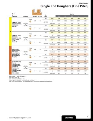 FRACTIONAL Single End Roughers (Fine Pitch) Ap Series Ae Ae DC • in 62 Vc Fractional Hardness Ae x DC Ap x DC (sfm) 1/4 3/8 1/2 3/4 1 405 RPM 6188 4126 3094 2063 1547 Profile ≤ 0.5 ≤ 1.5 Fz 0.0006 0.0011 0.0015 0.0019 0.0021 STAINLESS STEELS(FREE MACHINING)303, 416, 420F,430F, 440F≤ 275 Bhnor≤ 28 HRcSlot (324-486) Feed (ipm) 11.1 13.6 18.6 15.7 19.5325RPM49663311248316551242 1 ≤1 Fz 0.0006 0.0011 0.0015 0.0019 0.0021 (260-390) Feed (ipm) 8.9 10.9 14.9 12.6 15.6 M 280 RPM 4278 2852 2139 1426 1070 Profile STAINLESS STEELS ≤ 0.5(DIFFICULT)304, 304L, 316, 316L,17-4PH, 15-5PH,13-4PH,Custom 450≤ 275 Bhnor≤ 28 HRcSlot1≤ 1.5Fz0.0005(224-336)Feed (ipm)6.4225RPM3438≤1Fz0.00050.00097.722920.00090.001210.317190.00120.00158.611460.00150.001710.98600.0017 (180-270) Feed (ipm) 5.2 6.2 8.3 6.9 8.8 70 RPM 1070 713 535 357 267 Profile SUPER ALLOYS ≤ 0.5 ≤ 1.5 Fz 0.0004 0.0008 0.0010 0.0013 0.0014 (NICKEL, COBALT, (56-84) IRON BASE) ≤ 300 Bhn Feed (ipm) 1.3 1.7 2.1 1.9 2.2 Inconel 601, 617, or 625, Incoloy 800, ≤ 32 HRc 56 RPM 856 570 428 285 214 Monel 400, Rene, Slot Waspalloy 1 ≤1 Fz 0.0004 0.0008 0.0010 0.0013 0.0014 (45-67) Feed (ipm) 1.0 1.4 1.7 1.5 1.8 S TITANIUM ALLOYSTi6Al4V,Ti6Al2Sn4Zr2Mo,Profile ≤ 0.5Ti4Al4Mo2Sn0.5Si,Ti10Al2Fe3Al,Ti5Al53Mo3Cr,Ti7Al4Mo,Ti3Al8V6Cr4Zr4Mo,≤ 350 Bhnor≤ 38 HRcSlotTi6Al6V6Sn,1Ti152 Cr3Sn3Al155RPM2368≤ 1.5Fz0.0005(124-186)Feed (ipm)3.6195RPM2980≤1Fz0.0005(156-234)Feed (ipm)4.515790.00094.319860.00095.411840.00125.714900.00127.27890.00154.79930.00156.05920.00176.07450.00177.6 Bhn (Brinell) HRc (Rockwell C) rpm = (Vc x 3.82) / DC ipm = Fz x number of flutes x rpm reduce speed and feed for materials harder than listed refer to the SGS Tool Wizard® for complete technical information (www.kyocera-sgstool.com) www.kyocera-sEgNsDtoMoIl.LcLoSm END MILLS 217