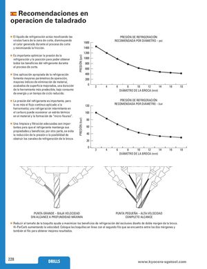 PRESIÓN (psi)PRESIÓN (bar) PRESIÓN (psi)PRESIÓN (bar) Recomendaciones en oSPpANeSISPrHAaNIcSHion de taladrado ◾ El líquido de refrigeración actúa movilizando las PRESIÓPNREDSEIÓRNEFDREIGREERFARCIGIÓENRACIÓN virutas fuera de la zona de corte, disminuyendoel calor generado durante el proceso de corte16001600RECOMREENCDOAMDEANPDOARDADIPÁOMREDTIRÁOM–EpTsRiO – psi y minimizando la fricción. 1400 1400 1200 1200 ◾ Es importante optimizar la presión de larefrigeración y la posición para poder obtener10001000 todos los beneficios del refrigerante durante 800 800 el proceso de corte. 600 600 ◾ Una aplicación apropiada de la refrigeración 400 400 fomenta mayores parámetros de operación, 200 200 mayores índices de eliminación de material,acabados de superficie mejorados, una duración0303446 68 8 10 1012 1214 1416 1618 18 de la herramienta más predecible, bajo consumo DIÁMEDTIRÁOMDEETRLAO BDREOLCAAB(RmOmC)A (mm) de energía y un tiempo de ciclo reducido. ◾ La presión del refrigerante es importante, perolo es más el flujo continuo aplicado a la120120 PRESIÓPNREDSEIÓRNEFDREIGREERFARCIGIÓENRACIÓNRECOMREENCDOAMDEANPDOARDADIPÁOMREDTIRÁOM–EbTaRrO – bar herramienta; una refrigeración intermitente en el carburo puede ocasionar un estrés térmico 100 100 en el material y la formación de “micro-fisuras”. 80 80 ◾ Una limpieza y filtración adecuadas son impor-tantes para que el refrigerante mantenga sus6060 propiedades y beneficios; por otra parte, se evita 40la reducción de la presión o la posibilidad de40 obstruir los canales de refrigeración de la broca. 20 20 0 30 34 46 68 8 10 1012 1214 1416 1618 18 DIÁMEDTIRÁOMDEETRLAO BDREOLCAAB(RmOmC)A (mm) PUNTAPGURNATNADGER–ANBADJEA– VBEALJOACIVDEALDOCIDAD PUNTAPPUENQTUAEPÑEAQ–UEAÑLTAA–VAELLTOACIVDEALDOCIDAD SIN ALSCIANNACLECAANPRCOEFAUPNRDOIDFUANDDMIDÁAXDIMMAÁXIMA COMPLCEOTMOPALLECTAONACLECANCE ◾ Reducir el tamaño de la boquilla ayuda a maximizar los beneficios de refrigeración del exclusivo diseño de doble margen de la broca. Hi-PerCarb aumentando la velocidad. Coloque las boquillas en línea con el segundo filo que se encuentra entre los dos márgenes y también el filo para obtener mejores resultados. 228 DRILLS www.kDyRoIcLeLrSa-sgstool.com