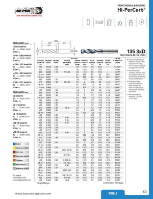 FRACTIONAL & METRIC Hi-PerCarb® 32° 145° 2 OAL TOLERANCES (inch) LCF LS ≤.1181 DIAMETER LU DC = +.00008/+.00047DCON = h6 DC DCON 135 3xD >.1181–.2362 DIAMETER FRACTIONAL & METRIC SERIES DC = +.00016/+.00063DCON = h6>.2362–.3937 DIAMETERDC= +.00024/+.00083 inch & mm EDP NO.CUTTINGDECIMALMETRICTAP SIZESHANKOVERALLFLUTECLEAREDSHANKTi-NAMITE-ADIAMETEREQUIV.EQUIV.REFERENCEDIAMETERLENGTHLENGTHLENGTHLENGTH(AlTiN)DCONLYDCONOALLCFLULS1/640.01560.401/81-1/21/85/64151752*• Double margin designimproves accuracy andsurface finish alongwith increased strengthfor aggressive drilling DCON = h6 1/32 0.0312 0.79 1/8 1-1/2 1/4 3/16 1 51269* • Specialized self- >.3937–.7087 DIAMETER 3/64 0.0469 1.191,25 mm0.04921/16-64 1/8 1-1/2 3/8 5/16 1 51270*3,038,09,58,025,064500*centering notched pointeliminates the need for DC = +.00028/+.00098 1,45 mm 0.0571 3,0 38,0 9,5 8,0 25,0 64501* spot drilling decreasing DCON = h6 #53 0.0595 1.51 1/8 1-1/2 3/8 5/16 1 64502* thrust and deflection >.7087–1.1811 DIAMETER 1/16 0.0625 1.59 5/64-60 1/8 2 7/16 3/8 1-1/4 51271*DC= +.00031/+.001141,6 mm0.06303,050,011,09,032,064503*• Engineered edgeprotection improvesedge strength and DCON = h6 1,75 mm 0.0689 3,0 50,0 11,0 9,0 32,0 64504* reduces edge fatigue #50 0.0700 1.78 1/8 2 7/16 3/8 1-1/4 64505* allowing for increased TOLERANCES (mm) 5/64 0.0781 1.98 1/8 2 1/2 7/16 1-1/4 51272* feed rates ≤3 DIAMETER #47 0.0785 1.99DC=+ 0, 0 0 2 /+ 0, 0122,05 mm0.08071/82 1/2 7/16 1-1/4 64506*3,050,012,011,032,064507*• Recommended formaterials ≤ 56 HRc(≤ 577 Bhn) DCON = h6 #46 0.0810 2.06#430.08902.26 1/8 2 1/2 7/16 1-1/4 64508*1/821/27/161-1/464509* >3–6 DIAMETER #42 0.0935 2.37 1/8 2 1/2 7/16 1-1/4 64510* DC = +0,004/+0,016 3/32 0.0938 2.38 1/8-32 1/8 2 1/2 7/16 1-1/4 51273 DCON = h6 #40 0.0980 2.49 1/8 2 9/16 1/2 1-1/4 51274 >6–10 DIAMETER 2,5 mm 0.0984#390.09952.53 3,0 50,0 14,0 12,0 32,0 64511 1/829/161/21-1/451753 DC = +0,006/+0,021 #38 0.1015 2.58 5-40 1/8 2 9/16 1/2 1-1/4 51754 DCON = h6 #37 0.1040 2.64 5-44 1/8 2 9/16 1/2 1-1/4 51755 >10–18 DIAMETER #36 0.1065 2.71 6-32 1/8 2 9/16 1/2 1-1/4 51756 DC = +0,007/+0,025 7/64 0.1094 2.78 1/8 2 5/8 9/16 1-1/4 51275 DCON = h6 #35 0.1100 2.79 1/8 2 5/8 9/16 1-1/4 51276 #34 0.1110 2.82 1/8 2 5/8 9/16 1-1/4 51277 >18–30 DIAMETER #33 0.1130 2.87 6-40 1/8 2 5/8 9/16 1-1/4 51757 DC = +0,008/+0,029 2,9 mm 0.1142 3,0 50,0 16,0 14,0 32,0 64512 DCON = h6 #32 0.1160 2.95 1/8 2 5/8 9/16 1-1/4 51758 3,0 mm 0.1181 6,0 62,0 20,0 17,0 36,0 63155 #31 0.1200 3.05 1/8 2 5/8 9/16 1-1/4 51759 STEELS 3,1 mm 0.1220 6,0 62,0 20,0 17,0 36,0 63741 STAINLESS STEELS 1/8 0.1250 3.18 1/4 2-1/2 3/4 21/32 1-7/16 51330 3,2 mm 0.1260 M3,5 X 0,35 6,0 62,0 20,0 17,0 36,0 63156 CAST IRON #30 0.1285 3.26 1/4 2-1/2 3/4 21/32 1-7/16 51278 3,3 mm 0.1299 M4 X 0,7 6,0 62,0 20,0 17,0 36,0 63157 HIGH TEMP ALLOYS 3,4 mm 0.1339 6,0 62,0 20,0 17,0 36,0 63158 TITANIUM #29 0.1360 3.45 8-32,8-36 1/4 2-1/2 3/4 21/32 1-7/16 51331 3,5 mm 0.1378 M4 X 0,5 6,0 62,0 20,0 17,0 36,0 63159 NON-FERROUS #28 0.1405 3.57 8-40 1/4 2-1/2 3/4 21/32 1-7/16 51760 HARDENED STEELS 9/64 0.1406 3.57 1/4 2-1/2 3/4 21/32 1-7/16 51332 3,6 mm 0.1417 M4 X 0,35 6,0 62,0 20,0 17,0 36,0 63160 #27 0.1440 3.66 1/4 2-1/2 3/4 21/32 1-7/16 51761 For patent 3,7 mm 0.1457 M4.5 X 0,75 6,0 62,0 20,0 17,0 36,0 63161 information visit #26 0.1470 3.73 3/16-24 1/4 2-1/2 3/4 21/32 1-7/16 51762 www.ksptpatents.com #25 0.1495 3.80 10-24 1/4 2-5/8 7/8 23/32 1-7/16 51333 *Single Margin continued on next page www.kyoceraD-sRgILsLtoSol.com DRILLS 231