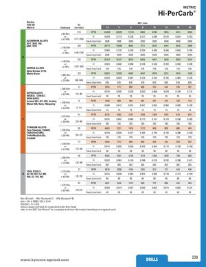 METRIC Hi-PerCarb® Series DC • mm 135 3D Vc Metric Hardness (m/min) 1.5 3 6 8 10 12 16 20 213 RPM 45239 22620 11310 8482 6786 5655 4241 3393 ≤ 80 Bhn or Fr 0.059 0.119 0.238 0.317 0.396 0.476 0.634 0.793 ALUMINUM ALLOYS ≤ 47 HRb (171-256) Feed (mm/min) 2690 2690 2690 2690 2690 2690 2690 2690 2017, 2024, 356, 6061, 7075 183 RPM 38777 19388 9694 7271 5816 4847 3635 2908≤ 150 Bhn or Fr 0.060 0.120 0.240 0.320 0.400 0.480 0.640 0.799 ≤ 7 HRc (146-219) Feed (mm/min) 2325 2325 2325 2325 2325 2325 2325 2325 N 152 RPM 32314 16157 8078 6059 4847 4039 3029 2424 ≤ 140 Bhn or Fr 0.024 0.048 0.096 0.128 0.160 0.192 0.256 0.320 COPPER ALLOYS ≤ 3 HRc (122-183) Feed (mm/min) 776 776 776 776 776 776 776 776 Alum Bronze, C110, Muntz Brass 122 RPM 25851 12926 6463 4847 3878 3231 2424 1939≤ 200 Bhn or Fr 0.024 0.049 0.097 0.130 0.162 0.195 0.260 0.325 ≤ 23 HRc (98-146) Feed (mm/min) 630 630 630 630 630 630 630 630 17 RPM 3555 1777 889 666 533 444 333 267 ≤ 300 Bhn SUPER ALLOYS(NICKEL , COBALT, or Fr 0.010 0.020 0.039 0.053 0.066 0.079 0.105 0.131≤ 32 HRc(13-20)Feed (mm/min)3535353535353535 IRON BASE) Inconel 601, 617, 625, Incoloy,Monel 400, Rene, Waspaloy≤ 400 Bhnor9RPM 1939 969 485 364 291 242 182 145Fr0.0080.0150.0310.0410.0520.0620.0830.103 ≤ 43 HRc (7-11) Feed (mm/min) 15 15 15 15 15 15 15 15 41 RPM 8725 4362 2181 1636 1309 1091 818 654 ≤ 275 Bhn S or Fr 0.021 0.042 0.085 0.113 0.141 0.170 0.226 0.283 ≤ 28 HRc (33-49) Feed (mm/min) 185 185 185 185 185 185 185 185 TITANIUM ALLOYS 30 RPM 6463 3231 1616 1212 969 808 606 485 Pure Titanium, Ti6Al4V, ≤ 350 Bhn Ti6Al2Sn4Zr2Mo, or Fr 0.019 0.039 0.077 0.103 0.129 0.155 0.206 0.258 Ti4Al4Mo2Sn0.5Si, ≤ 38 HRc (24-37) Ti-6Al4V Feed (mm/min) 125 125 125 125 125 125 125 125 17 RPM 3555 1777 889 666 533 444 333 267 ≤ 440 Bhn or Fr 0.014 0.028 0.056 0.075 0.094 0.113 0.150 0.188 ≤ 47 HRc (13-20) Feed (mm/min) 50 50 50 50 50 50 50 50 40 RPM 8402 4201 2100 1575 1260 1050 788 630 ≤ 200 Bhn or Fr 0.032 0.063 0.126 0.168 0.210 0.252 0.336 0.421 ≤ 13 HRc (32-48) Feed (mm/min) 265 265 265 265 265 265 265 265 TOOL STEELS 27 RPM 5816 2908 1454 1091 872 727 545 436≤ 375 Bhn H A2, D2, H13, L2, M2, or Fr 0.014 0.028 0.055 0.073 0.092 0.110 0.147 0.183 P20, S7, T15, W2 ≤ 40 HRc (22-33) Feed (mm/min) 80 80 80 80 80 80 80 80 23 RPM 4847 2424 1212 909 727 606 454 364 ≤ 475 Bhn or Fr 0.009 0.019 0.037 0.050 0.062 0.074 0.099 0.124 ≤ 50 HRc (18-27) Feed (mm/min) 45 45 45 45 45 45 45 45 Bhn (Brinell) HRc (Rockwell C) HRb (Rockwell B) rpm = (Vc x 1000) / (DC x 3.14) mm/min = Fr x rpm reduce speed and feed for materials harder than listed refer to the SGS Tool Wizard® for complete technical information (www.kyocera-sgstool.com) www.kyoceraD-sRgILsLtoSol.com DRILLS 239