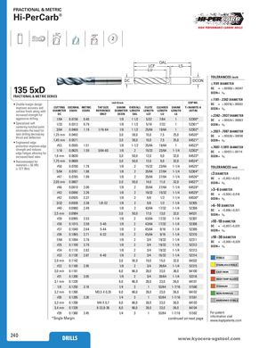 FRACTIONAL & METRIC Hi-PerCarb® 32° 145° 2 OAL LCF LS LU TOLERANCES (inch) DC DCON ≤.1181 DIAMETER 135 5xD DC = +.00008/+.00047DCON =h6 FRACTIONAL & METRIC SERIES >.1181–.2362 DIAMETER • Double margin design inch & mm EDP NO. DC = +.00016/+.00063 improves accuracy and CUTTING DECIMAL METRIC TAP SIZE SHANK OVERALL FLUTE CLEARED SHANK Ti-NAMITE-Asurface finish along withDIAMETEREQUIV.EQUIV.REFERENCEDIAMETERLENGTHLENGTHLENGTHLENGTH(AlTiN)DCON =h6 increased strength for DC ONLY DCON OAL LCF LU LS >.2362–.3937 DIAMETER aggressive drilling 1/64 0.0156 0.40 1/8 1 1/2 5/32 7/64 1 52300* DC = +.00024/+.00083 • Specialized self- 1/32 0.0312 0.79centering notched point1/8 1 1/2 5/16 7/32 1 52301* DCON = h6 eliminates the need for 3/64 0.0469 1.19 1/16-64 1/8 1 1/2 25/64 19/64 1 52302* >.3937–.7087 DIAMETER spot drilling decreasing 1,25 mm 0.0492thrust and deflection 3,0 38,0 10,0 7,5 25,0 64520* DC = +.00028/+.00098 1,45 mm 0.0571• Engineered edge 3,0 38,0 10,0 7,5 25,0 64521* DCON = h6 protection improves edge #53 0.0595 1.51 1/8 1-1/2 25/64 19/64 1 64522* >.7087–1.1811 DIAMETER strength and reduces 1/16 0.0625 1.59 5/64-60 1/8 2 15/32 23/64 1-1/4 52303*edge fatigue allowing forDC=+.00031/+.00114 increased feed rates 1,6 mm 0.0630 3,0 50,0 12,0 9,0 32,0 64523* DCON = h6 • Recommended for 1,75 mm 0.0689 3,0 50,0 12,0 9,0 32,0 64524* materials ≤ 56 HRc #50 0.0700 1.78(≤ 577 Bhn) 1/8 2 15/32 23/64 1-1/4 64525* TOLERANCES (mm) 5/64 0.0781 1.98 1/8 2 35/64 27/64 1-1/4 52304* ≤3 DIAMETER #47 0.0785 1.99 1/8 2 35/64 27/64 1-1/4 64526* DC = + 0, 0 0 2 /+ 0, 012 2,05 mm 0.0807 3,0 50,0 14,0 11,0 32,0 64527* DCON = h6 #46 0.0810 2.06 1/8 2 35/64 27/64 1-1/4 64528* >3–6 DIAMETER #43 0.0890 2.26 1/8 2 19/32 15/32 1-1/4 64529* DC = +0,004/+0,016 #42 0.0935 2.37 1/8 2 5/8 1/2 1-1/4 64530* DCON = h6 3/32 0.0938 2.38 1/8-32 1/8 2 5/8 1/2 1-1/4 52305 >6–10 DIAMETER #40 0.0980 2.49 1/8 2 43/64 17/32 1-1/4 52306 DC = +0,006/+0,021 2,5 mm 0.0984 3,0 50,0 17,0 13,0 32,0 64531 DCON = h6 #39 0.0995 2.53 1/8 2 43/64 17/32 1-1/4 52307 >10–18 DIAMETER #38 0.1015 2.58 5-40 1/8 2 43/64 17/32 1-1/4 52308 DC = +0,007/+0,025 #37 0.1040 2.64 5-44 1/8 2 45/64 9/16 1-1/4 52309 DCON = h6 #36 0.1065 2.71 6-327/640.10942.781/8 2 45/64 9/16 1-1/4 52310 1/823/419/321-1/452311 >18–30 DIAMETERDC=+0,008/+0,029 #35 0.1100 2.79 1/8 2 3/4 19/32 1-1/4 52312 DCON = h6 #34 0.1110 2.82 1/8 2 3/4 19/32 1-1/4 52313 #33 0.1130 2.87 6-40 1/8 2 3/4 19/32 1-1/4 52314 STEELS 2,9 mm 0.1142 3,0 50,0 19,0 15,0 32,0 64532 #32 0.1160 2.95 1/8 2 3/4 39/64 1-1/4 52315 STAINLESS STEELS 3,0 mm 0.1181 6,0 66,0 28,0 23,0 36,0 64100 CAST IRON #31 0.1200 3.05 1/8 2 3/4 39/64 1-1/4 52316 HIGH TEMP ALLOYS 3,1 mm 0.1220 6,0 66,0 28,0 23,0 36,0 64101 1/8 0.1250 3.18 1/4 3 1 53/64 1-7/16 51580 TITANIUM 3,2 mm 0.1260 M3,5 X 0,35 6,0 66,0 28,0 23,0 36,0 64102 NON-FERROUS #30 0.1285 3.26 1/4 3 1 53/64 1-7/16 51581 3,3 mm 0.1299 M4 X 0,7 6,0 66,0 28,0 23,0 36,0 64103 HARDENED STEELS 3,4 mm 0.1339 8-32,8-36 6,0 66,0 28,0 23,0 36,0 64104 #29 0.1360 3.45 1/4 3 1 53/64 1-7/16 51582 For patent *Single Margin continued on next page information visitwww.ksptpatents.com 240 DRILLS www.kDyRoIcLeLrSa-sgstool.com