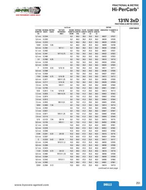 FRACTIONAL & METRIC Hi-PerCarb® 131N 3xD FRACTIONAL & METRIC SERIES inch & mm EDP NO. CONTINUED CUTTING DECIMAL METRIC TAP SIZE SHANK OVERALL FLUTE CLEARED SHANK UNCOATED Ti-NAMITE-B DIAMETER EQUIV. EQUIV. REFERENCE DIAMETER LENGTH LENGTH LENGTH LENGTH (TiB2) DC ONLY DCON OAL LCF LU LS 5,7 mm 0.2244 6,0 66,0 28,0 20,0 36,0 64627 67627 5,8 mm 0.2283 6,0 66,0 28,0 20,0 36,0 64628 67628 5,9 mm 0.2323 6,0 66,0 28,0 20,0 36,0 64629 67629 15/64 0.2344 5.95 6,0 66,0 28,0 20,0 36,0 54609 54709 6,0 mm 0.2362 M7 X 1 6,0 66,0 28,0 20,0 36,0 64630 67630 6,1 mm 0.2402 8,0 79,0 34,0 24,0 36,0 64631 67631 6,2 mm 0.2441 M7 X 0,75 8,0 79,0 34,0 24,0 36,0 64632 67632 6,3 mm 0.2480 8,0 79,0 34,0 24,0 36,0 64633 67633 1/4 0.2500 6.35 8,0 79,0 34,0 24,0 36,0 54610 54710 6,4 mm 0.2520 8,0 79,0 34,0 24,0 36,0 64634 67634 6,5 mm 0.2559 8,0 79,0 34,0 24,0 36,0 64635 67635 F 0.2570 6.53 5/16-18 8,0 79,0 34,0 24,0 36,0 54611 54711 6,6 mm 0.2598 8,0 79,0 34,0 24,0 36,0 64636 67636 6,7 mm 0.2638 8,0 79,0 34,0 24,0 36,0 64637 67637 17/64 0.2656 6.75 5/16-20 8,0 79,0 34,0 24,0 36,0 54612 54712 6,8 mm 0.2677 M8 X 1,25 8,0 79,0 34,0 24,0 36,0 64638 67638 6,9 mm 0.2717 5/16-24 8,0 79,0 34,0 24,0 36,0 64639 67639 7,0 mm 0.2756 M8 X 1 8,0 79,0 34,0 24,0 36,0 64640 67640 7,1 mm 0.2795 8,0 79,0 41,0 29,0 36,0 64641 67641 9/32 0.2812 7.14 5/16-32 8,0 79,0 41,0 29,0 36,0 54613 54713 7,2 mm 0.2835 M8 X 0,75 8,0 79,0 41,0 29,0 36,0 64642 67642 7,3 mm 0.2874 8,0 79,0 41,0 29,0 36,0 64643 67643 7,4 mm 0.2913 8,0 79,0 41,0 29,0 36,0 64644 67644 7,5 mm 0.2953 M8 X 0,5 8,0 79,0 41,0 29,0 36,0 64645 67645 19/64 0.2969 7.54 8,0 79,0 41,0 29,0 36,0 54614 54714 7,6 mm 0.2992 8,0 79,0 41,0 29,0 36,0 64646 67646 7,7 mm 0.3031 8,0 79,0 41,0 29,0 36,0 64647 67647 7,8 mm 0.3071 M9 X 1,25 8,0 79,0 41,0 29,0 36,0 64648 67648 7,9 mm 0.3110 8,0 79,0 41,0 29,0 36,0 64649 67649 5/16 0.3125 7.94 3/8-16 8,0 79,0 41,0 29,0 36,0 54615 54715 8,0 mm 0.3150 M9 X 1 8,0 79,0 41,0 29,0 36,0 64650 67650 8,1 mm 0.3189 10,0 89,0 47,0 35,0 40,0 64651 67651 8,2 mm 0.3228 10,0 89,0 47,0 35,0 40,0 64652 67652 8,3 mm 0.3268 10,0 89,0 47,0 35,0 40,0 64653 67653 21/64 0.3281 8.33 3/8-20 10,0 89,0 47,0 35,0 40,0 54616 54716 8,4 mm 0.3307 10,0 89,0 47,0 35,0 40,0 64654 67654 Q 0.3320 8.43 3/8-24 10,0 89,0 47,0 35,0 40,0 54617 54717 8,5 mm 0.3346 M10 X 1,5 10,0 89,0 47,0 35,0 40,0 64655 67655 8,6 mm 0.3386 10,0 89,0 47,0 35,0 40,0 64656 67656 8,7 mm 0.3425 10,0 89,0 47,0 35,0 40,0 64657 67657 11/32 0.3438 8.73 3/8-32 10,0 89,0 47,0 35,0 40,0 54618 54718 8,8 mm 0.3465 M10 X 1,25 10,0 89,0 47,0 35,0 40,0 64658 67658 8,9 mm 0.3504 10,0 89,0 47,0 35,0 40,0 64659 67659 9,0 mm 0.3543 M10 X 1 10,0 89,0 47,0 35,0 40,0 64660 67660 9,1 mm 0.3583 10,0 89,0 47,0 35,0 40,0 64661 67661 23/64 0.3594 9.13 10,0 89,0 47,0 35,0 40,0 54619 54719 continued on next page www.kyoceraD-sRgILsLtoSol.com DRILLS 251