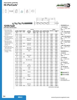 FRACTIONAL & METRIC Hi-PerCarb® 30° 124° 3 OAL LCF LS LU DC DCON 131N 5xD TOLERANCES (inch) FRACTIONAL & METRIC SERIES ≤.1181 DIAMETER DC = +.00008/+.00047 • Triple margin design inch & mm EDP NO. DCON = h6 improves hole stability CUTTING DECIMAL METRIC TAP SIZE SHANK OVERALL FLUTE CLEARED SHANK UNCOATED Ti-NAMITE-B and size control while DIAMETER EQUIV. EQUIV. REFERENCE DIAMETER LENGTH LENGTH LENGTH LENGTH (TiB2) >.1181–.2362 DIAMETER providing superior DC ONLY DCON OAL LCF LU LS DC = +.00016/+.00063 finish, roundness and 3,0 mm 0.1181cylindricity 6,0 66,0 28,0 23,0 36,0 65000 64800 DCON = h6 3,1 mm 0.1220• Self-stabilizing pyramid 6,0 66,0 28,0 23,0 36,0 65001 64801 >.2362–.3937 DIAMETER point design stabilizes 1/8 0.1250 3.18 6,0 66,0 28,0 23,0 36,0 55000 54800 DC = +.00024/+.00083 the drill on contact with 3,2 mm 0.1260the workpieceM3,5 X 0,35 6,0 66,0 28,0 23,0 36,0 65002 64802 DCON = h6 • Open flute structure 3,3 mm 0.1299 M4 X 0,7 6,0 66,0 28,0 23,0 36,0 65003 64803 >.3937–.7087 DIAMETER efficiently transports 3,4 mm 0.1339 6,0 66,0 28,0 23,0 36,0 65004 64804 DC = +.00028/+.00098 chips while maintainingstrength at high#290.1360 3.45 8-32,8-36 6,0 66,0 28,0 23,0 36,0 55001 54801 DCON = h6 feed rates 3,5 mm 0.1378 M4 X 0,5 6,0 66,0 28,0 23,0 36,0 65005 64805 >.7087–1.1811 DIAMETER • Sculpted gash allows 9/64 0.1406 3.57 6,0 66,0 28,0 23,0 36,0 55002 54802 DC = +.00031/+.00114 chips to easily flow awayfrom the drill center3,6 mm0.1417 M4 X 0,35 6,0 66,0 28,0 23,0 36,0 65006 64806 DCON = h6 • Recommended for 3,7 mm 0.1457 M4,5 X 0,75 6,0 66,0 28,0 23,0 36,0 65007 64807 materials ≤ 175 Bhn 3,8 mm 0.1496 10-24 6,0 74,0 36,0 29,0 36,0 65008 64808 TOLERANCES (mm) (≤ 16 HRc) 3,9 mm 0.1535 6,0 74,0 36,0 29,0 36,0 65009 64809 ≤3 DIAMETER 5/32 0.1562 3.97 6,0 74,0 36,0 29,0 36,0 55003 54803 DC = + 0, 0 0 2 /+ 0, 012 4,0 mm 0.1575 M4,5 X 0,5 6,0 74,0 36,0 29,0 36,0 65010 64810 DCON = h6 #21 0.1590 4.04 10-324,1 mm0.16146,0 74,0 36,0 29,0 36,0 55004 548046,074,036,029,036,06501164811>3–6 DIAMETERDC=+0,004/+0,016 4,2 mm 0.1654 M5 / M5 X 0,75 6,0 74,0 36,0 29,0 36,0 65012 64812 DCON = h6 4,3 mm 0.1693 6,0 74,0 36,0 29,0 36,0 65013 64813 11/64 0.1719 4.37 6,0 74,0 36,0 29,0 36,0 55005 54805 >6–10 DIAMETERDC=+0,006/+0,021 4,4 mm 0.1732 12-24 6,0 74,0 36,0 29,0 36,0 65014 64814 DCON = h6 4,5 mm 0.1772 M5 X 0,5 6,0 74,0 36,0 29,0 36,0 65015 64815 4,6 mm 0.1811 12-28 6,0 74,0 36,0 29,0 36,0 65016 64816 >10–18 DIAMETER DC = +0,007/+0,025 4,7 mm 0.1850 12-32 6,0 74,0 36,0 29,0 36,0 65017 64817 DCON = h6 3/16 0.1875 4.76 6,0 82,0 44,0 35,0 36,0 55006 54806 4,8 mm 0.1890 7/32-32 6,0 82,0 44,0 35,0 36,0 65018 64818 NON-FERROUS 4,9 mm 0.1929 6,0 82,0 44,0 35,0 36,0 65019 64819 5,0 mm 0.1969 M6 X 1 6,0 82,0 44,0 35,0 36,0 65020 64820 PLASTICS/COMPOSITES 5,1 mm 0.2008 1/4-20 6,0 82,0 44,0 35,0 36,0 65021 64821 13/64 0.2031 5.16 6,0 82,0 44,0 35,0 36,0 55007 54807 For patent 5,2 mm 0.2047 M6 X 0,75 6,0 82,0 44,0 35,0 36,0 65022 64822 information visit 5,3 mm 0.2087 6,0 82,0 44,0 35,0 36,0 65023 64823 www.ksptpatents.com 5,4 mm 0.2126 6,0 82,0 44,0 35,0 36,0 65024 64824 5,5 mm 0.2165 M6 X 0,5 6,0 82,0 44,0 35,0 36,0 65025 64825 7/32 0.2188 5.56 1/4-32 6,0 82,0 44,0 35,0 36,0 55008 54808 continued on next page 254 DRILLS www.kDyRoIcLeLrSa-sgstool.com