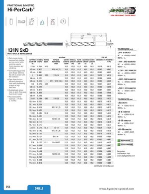 FRACTIONAL & METRIC Hi-PerCarb® 30° 124° 3 OAL LCF LS LU DC DCON 131N 5xD TOLERANCES (inch) FRACTIONAL & METRIC SERIES ≤.1181 DIAMETER DC = +.00008/+.00047 • Triple margin design inch & mm EDP NO. DCON = h6 improves hole stability CUTTING DECIMAL METRIC TAP SIZE SHANK OVERALL FLUTE CLEARED SHANK UNCOATED Ti-NAMITE-B and size control while DIAMETER EQUIV. EQUIV. REFERENCE DIAMETER LENGTH LENGTH LENGTH LENGTH (TiB2) >.1181–.2362 DIAMETER providing superior DC ONLY DCON OAL LCF LU LS DC = +.00016/+.00063 finish, roundness and 23/64 0.3594 9.13cylindricity 10,0 103,0 61,0 49,0 40,0 55019 54819 DCON = h6 9,2 mm 0.3622• Self-stabilizing pyramidM10 X 0,7510,0103,0 61,0 49,0 40,0 65062 64862 >.2362–.3937 DIAMETER point design stabilizes 9,3 mm 0.3661 10,0 103,0 61,0 49,0 40,0 65063 64863 DC = +.00024/+.00083 the drill on contact withthe workpieceU 0.3680 9.35 7/16-14 10,0 103,0 61,0 49,0 40,0 55020 54820 DCON = h6 • Open flute structure 9,4 mm 0.3701 10,0 103,0 61,0 49,0 40,0 65064 64864 >.3937–.7087 DIAMETER efficiently transports 9,5 mm 0.3740 M11 / M10 X 0,5 10,0 103,0 61,0 49,0 40,0 65065 64865 DC = +.00028/+.00098 chips while maintaining 3/8 0.3750 9.53strength at high 10,0 103,0 61,0 49,0 40,0 55021 54821 DCON = h6 feed rates 9,6 mm 0.3780 10,0 103,0 61,0 49,0 40,0 65066 64866 >.7087–1.1811 DIAMETER • Sculpted gash allows 9,7 mm 0.3819 10,0 103,0 61,0 49,0 40,0 65067 64867 DC = +.00031/+.00114 chips to easily flow awayfrom the drill center9,8 mm0.3858 10,0 103,0 61,0 49,0 40,0 65068 64868 DCON = h6 • Recommended for 9,9 mm 0.3898 10,0 103,0 61,0 49,0 40,0 65069 64869 materials ≤ 175 Bhn 25/64 0.3906 9.92 7/16-20 10,0 103,0 61,0 49,0 40,0 55022 54822 TOLERANCES (mm) (≤ 16 HRc) 10,0 mm 0.3937 10,0 103,0 61,0 49,0 40,0 65070 64870 ≤3 DIAMETER 10,1 mm 0.3976 12,0 118,0 71,0 56,0 45,0 65071 64871 DC = + 0, 0 0 2 /+ 0, 012 10,2 mm 0.4016 M12 X 1,75 12,0 118,0 71,0 56,0 45,0 65072 64872 DCON = h6 10,3 mm 0.405513/320.406210.32 12,0 118,0 71,0 56,0 45,0 65073 6487312,0118,071,056,045,05502354823>3–6 DIAMETERDC=+0,004/+0,016 10,4 mm 0.4094 12,0 118,0 71,0 56,0 45,0 65074 64874 DCON = h6 10,5 mm 0.4134 M12 X 1,5 12,0 118,0 71,0 56,0 45,0 65075 64875 10,6 mm 0.4173 12,0 118,0 71,0 56,0 45,0 65076 64876 >6–10 DIAMETERDC=+0,006/+0,021 10,7 mm 0.4213 12,0 118,0 71,0 56,0 45,0 65077 64877 DCON = h6 27/64 0.4219 10.72 1/2-13 12,0 118,0 71,0 56,0 45,0 55024 54824 10,8 mm 0.4252 M12 X 1,25 12,0 118,0 71,0 56,0 45,0 65078 64878 >10–18 DIAMETER DC = +0,007/+0,025 10,9 mm 0.4291 12,0 118,0 71,0 56,0 45,0 65079 64879 DCON = h6 11,0 mm 0.4331 M12 X 1 12,0 118,0 71,0 56,0 45,0 65080 64880 11,1 mm 0.4370 12,0 118,0 71,0 56,0 45,0 65081 64881 NON-FERROUS 7/16 0.4375 11.11 1/4-18NPT 12,0 118,0 71,0 56,0 45,0 55025 54825 11,2 mm 0.4409 12,0 118,0 71,0 56,0 45,0 65082 64882 PLASTICS/COMPOSITES 11,3 mm 0.4449 12,0 118,0 71,0 56,0 45,0 65083 64883 11,4 mm 0.4488 12,0 118,0 71,0 56,0 45,0 65084 64884 For patent 11,5 mm 0.4528 M12 X 0,5 12,0 118,0 71,0 56,0 45,0 65085 64885 information visit 11,6 mm 0.4567 12,0 118,0 71,0 56,0 45,0 65086 64886 www.ksptpatents.com 11,7 mm 0.4606 12,0 118,0 71,0 56,0 45,0 65087 64887 11,8 mm 0.4646 12,0 118,0 71,0 56,0 45,0 65088 64888 continued on next page 256 DRILLS www.kDyRoIcLeLrSa-sgstool.com