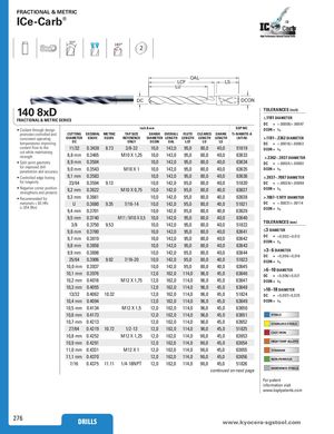 FRACTIONAL & METRIC ICe-Carb® ® 30° 140° 2 OAL LCF LS LU DC DCON 140 8xD TOLERANCES (inch) FRACTIONAL & METRIC SERIES ≤.1181 DIAMETER DC = +.00008/+.00047 • Coolant through design inch & mm EDP NO. DCON = h6 promotes controlled and CUTTING DECIMAL METRIC TAP SIZE SHANK OVERALL FLUTE CLEARED SHANK Ti-NAMITE-A consistent operating DIAMETER EQUIV. EQUIV. REFERENCE DIAMETER LENGTH LENGTH LENGTH LENGTH (AlTiN) >.1181–.2362 DIAMETER temperatures improving DC ONLY DCON OAL LCF LU LS DC = +.00016/+.00063 coolant flow to the 11/32 0.3438 8.73 3/8-32 10,0 142,0 95,0 80,0 40,0 51819cut while maintainingstrength8,8 mm0.3465M10 X 1,2510,0142,095,080,040,063633DCON =h6>.2362–.3937 DIAMETER • Split point geometry 8,9 mm 0.3504 10,0 142,0 95,0 80,0 40,0 63634 DC = +.00024/+.00083 for improved drillpenetration and accuracy9,0 mm0.3543 M10 X 1 10,0 142,0 95,0 80,0 40,0 63635 DCON = h6 • Controlled edge honing 9,1 mm 0.3583 10,0 142,0 95,0 80,0 40,0 63636 >.3937–.7087 DIAMETER for longevity 23/64 0.3594 9.13 10,0 142,0 95,0 80,0 40,0 51820 DC = +.00028/+.00098 • Negative corner positionstrengthens and protects9,2 mm0.3622 M10 X 0,75 10,0 142,0 95,0 80,0 40,0 63637 DCON = h6 • Recommended for 9,3 mm 0.3661 10,0 142,0 95,0 80,0 40,0 63638 >.7087–1.1811 DIAMETER materials ≤ 60 HRc U 0.3680 9.35 7/16-14 10,0 142,0 95,0 80,0 40,0 51821 DC = +.00031/+.00114 (≤ 654 Bhn) 9,4 mm 0.3701 10,0 142,0 95,0 80,0 40,0 63639 DCON = h6 9,5 mm 0.3740 M11 / M10 X 0,5 10,0 142,0 95,0 80,0 40,0 63640 3/8 0.3750 9.53 10,0 142,0 95,0 80,0 40,0 51822 TOLERANCES (mm) 9,6 mm 0.3780 10,0 142,0 95,0 80,0 40,0 63641 ≤3 DIAMETER 9,7 mm 0.3819 10,0 142,0 95,0 80,0 40,0 63642 DC = + 0, 0 0 2 /+ 0, 012 DCON = h6 9,8 mm 0.3858 10,0 142,0 95,0 80,0 40,0 63643 9,9 mm 0.3898 10,0 142,0 95,0 80,0 40,0 63644 >3–6 DIAMETER DC = +0,004/+0,016 25/64 0.3906 9.92 7/16-20 10,0 142,0 95,0 80,0 40,0 51823 DCON = h6 10,0 mm 0.3937 10,0 142,0 95,0 80,0 40,0 63645 >6–10 DIAMETER 10,1 mm 0.3976 12,0 162,0 114,0 96,0 45,0 63646 DC = +0,006/+0,021 10,2 mm 0.4016 M12 X 1,75 12,0 162,0 114,0 96,0 45,0 63647 DCON = h6 10,3 mm 0.4055 12,0 162,0 114,0 96,0 45,0 63648 >10–18 DIAMETER 13/32 0.4062 10.32 12,0 162,0 114,0 96,0 45,0 51824 DC = +0,007/+0,025 10,4 mm 0.4094 12,0 162,0 114,0 96,0 45,0 63649 DCON = h6 10,5 mm 0.4134 M12 X 1,5 12,0 162,0 114,0 96,0 45,0 63650 10,6 mm 0.4173 12,0 162,0 114,0 96,0 45,0 63651 STEELS 10,7 mm 0.4213 12,0 162,0 114,0 96,0 45,0 63652 STAINLESS STEELS 27/64 0.4219 10.72 1/2-13 12,0 162,0 114,0 96,0 45,0 51825 CAST IRON 10,8 mm 0.4252 M12 X 1,25 12,0 162,0 114,0 96,0 45,0 63653 10,9 mm 0.4291 12,0 162,0 114,0 96,0 45,0 63654 HIGH TEMP ALLOYS 11,0 mm 0.4331 M12 X 1 12,0 162,0 114,0 96,0 45,0 63655 TITANIUM 11,1 mm 0.4370 12,0 162,0 114,0 96,0 45,0 63656 NON-FERROUS 7/16 0.4375 11.11 1/4-18NPT 12,0 162,0 114,0 96,0 45,0 51826 continued on next page HARDENED STEELS For patent information visit www.ksptpatents.com 276 DRILLS www.kDyRoIcLeLrSa-sgstool.com