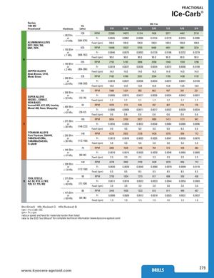 FRACTIONAL ICe-Carb® Series DC • in 140 8D Vc Fractional Hardness (sfm) 1/8 3/16 1/4 3/8 1/2 5/8 3/4 730 RPM 22309 14873 11154 7436 5577 4462 3718 ≤ 80 Bhn or Fr 0.0045 0.0067 0.0090 0.0134 0.0179 0.0224 0.0269 ALUMINUM ALLOYS ≤ 47 HRb (584-876) Feed (ipm) 100.0 100.0 100.0 100.0 100.0 100.0 100.0 2017, 2024, 356, 6061, 7075 635 RPM 19406 12937 9703 6469 4851 3881 3234≤ 150 Bhn or Fr 0.0046 0.0070 0.0093 0.0139 0.0186 0.0232 0.0278 ≤ 7 HRc (508-762) Feed (ipm) 90.0 90.0 90.0 90.0 90.0 90.0 90.0 N 255 RPM 7793 5195 3896 2598 1948 1559 1299 ≤ 140 Bhn or Fr 0.0018 0.0027 0.0036 0.0054 0.0072 0.0090 0.0108 COPPER ALLOYS ≤ 3 HRc (204-306) Feed (ipm) 14.0 14.0 14.0 14.0 14.0 14.0 14.0 Alum Bronze, C110, Muntz Brass 235 RPM 7182 4788 3591 2394 1795 1436 1197≤ 200 Bhn or Fr 0.0018 0.0027 0.0036 0.0054 0.0072 0.0091 0.0109 ≤ 23 HRc (188-282) Feed (ipm) 13.0 13.0 13.0 13.0 13.0 13.0 13.0 65 RPM 1986 1324 993 662 497 397 331 ≤ 300 Bhn SUPER ALLOYS(NICKEL , COBALT, or Fr 0.0009 0.0013 0.0017 0.0026 0.0034 0.0043 0.0051≤ 32 HRc(52-78)Feed (ipm)1.71.71.71.71.71.71.7 IRON BASE) Inconel 601, 617, 625, Incoloy,Monel 400, Rene, Waspaloy≤ 400 Bhnor35RPM 1070 713 535 357 267 214 178Fr0.00060.00080.00110.00170.00220.00280.0034 ≤ 43 HRc (28-42) Feed (ipm) 0.6 0.6 0.6 0.6 0.6 0.6 0.6 185 RPM 5654 3769 2827 1885 1413 1131 942 ≤ 275 Bhn S or Fr 0.0016 0.0024 0.0032 0.0048 0.0064 0.0080 0.0096 ≤ 28 HRc (148-222) Feed (ipm) 9.0 9.0 9.0 9.0 9.0 9.0 9.0 TITANIUM ALLOYS 140 RPM 4278 2852 2139 1426 1070 856 713 Pure Titanium, Ti6Al4V, ≤ 350 Bhn Ti6Al2Sn4Zr2Mo, or Fr 0.0012 0.0018 0.0023 0.0035 0.0047 0.0058 0.0070 Ti4Al4Mo2Sn0.5Si, ≤ 38 HRc (112-168) Ti-6Al4V Feed (ipm) 5.0 5.0 5.0 5.0 5.0 5.0 5.0 75 RPM 2292 1528 1146 764 573 458 382 ≤ 440 Bhn or Fr 0.0010 0.0015 0.0020 0.0030 0.0040 0.0050 0.0060 ≤ 47 HRc (60-90) Feed (ipm) 2.3 2.3 2.3 2.3 2.3 2.3 2.3 140 RPM 4278 2852 2139 1426 1070 856 713 ≤ 200 Bhn or Fr 0.0020 0.0030 0.0040 0.0060 0.0079 0.0099 0.0119 ≤ 13 HRc (112-168) Feed (ipm) 8.5 8.5 8.5 8.5 8.5 8.5 8.5 90 RPM 2750 1834 1375 917 688 550 458 TOOL STEELS ≤ 375 Bhn H A2, D2, H13, L2, M2, or Fr 0.0011 0.0016 0.0022 0.0033 0.0044 0.0055 0.0065 P20, S7, T15, W2 ≤ 40 HRc (72-108) Feed (ipm) 3.0 3.0 3.0 3.0 3.0 3.0 3.0 80 RPM 2445 1630 1222 815 611 489 407 ≤ 475 Bhn or Fr 0.0006 0.0009 0.0012 0.0018 0.0025 0.0031 0.0037 ≤ 50 HRc (64-96) Feed (ipm) 1.5 1.5 1.5 1.5 1.5 1.5 1.5 Bhn (Brinell) HRc (Rockwell C) HRb (Rockwell B) rpm = Vc x 3.82 / DC ipm = Fr x rpm reduce speed and feed for materials harder than listed refer to the SGS Tool Wizard® for complete technical information (www.kyocera-sgstool.com) www.kyoceraD-sRgILsLtoSol.com DRILLS 279