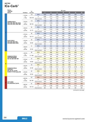 METRIC ICe-Carb® Series DC • mm 140M 8D Vc Metric Hardness (m/min) 3 6 8 10 12 14 16 123 RPM 13087 6544 4908 3926 3272 2804 2454 ≤ 175 Bhn or Fr 0.085 0.171 0.228 0.285 0.342 0.399 0.455 ≤ 7 HRc (100-170) Feed (mm/min) 1118 1118 1118 1118 1118 1118 1118 113 RPM 11956 5978 4484 3587 2989 2562 2242 CARBON STEELS ≤ 275 Bhn 1018, 1040, 1080, 1090, 10L50, or Fr 0.072 0.144 0.193 0.241 0.289 0.337 0.385 1140, 1212, 12L15, 1525, 1536 ≤ 28 HRc (90-135) Feed (mm/min) 864 864 864 864 864 864 864 64 RPM 6786 3393 2545 2036 1696 1454 1272 ≤ 425 Bhn or Fr 0.062 0.124 0.165 0.206 0.247 0.288 0.329 ≤ 45 HRc (51-77) Feed (mm/min) 419 419 419 419 419 419 419 P 98 RPM 10340 5170 3878 3102 2585 2216 1939 ≤ 275 Bhn or Fr 0.061 0.123 0.164 0.205 0.246 0.287 0.328 ≤ 28 HRc (78-117) Feed (mm/min) 635 635 635 635 635 635 635 58 RPM 6140 3070 2302 1842 1535 1316 1151 ALLOY STEELS ≤ 375 Bhn 4140, 4150, 4320, 5120, or Fr 0.048 0.095 0.127 0.159 0.190 0.222 0.254 5150, 8630, 86L20, 50100 ≤ 40 HRc (46-69) Feed (mm/min) 292 292 292 292 292 292 292 41 RPM 4362 2181 1636 1309 1091 935 818 ≤ 450 Bhn or Fr 0.038 0.076 0.101 0.126 0.151 0.177 0.202 ≤ 48 HRc (33-49) Feed (mm/min) 165 165 165 165 165 165 165 88 RPM 9371 4686 3514 2811 2343 2008 1757 ≤ 185 Bhn or Fr 0.047 0.095 0.126 0.158 0.190 0.221 0.253 STAINLESS STEELS ≤ 9 HRc (71-106) Feed (mm/min) 445 445 445 445 445 445 445 (FREE MACHINING) 303, 416, 420F, 430F, 440F 55≤ 275 Bhn RPM 5816 2908 2181 1745 1454 1246 1091 or Fr 0.044 0.087 0.116 0.146 0.175 0.204 0.233 ≤ 28 HRc (44-66) Feed (mm/min) 254 254 254 254 254 254 254 M 40 RPM 4201 2100 1575 1260 1050 900 788 ≤ 275 Bhn or Fr 0.042 0.085 0.113 0.141 0.169 0.198 0.226 STAINLESS STEELS ≤ 28 HRc (32-48) (DIFFICULT) Feed (mm/min) 178 178 178 178 178 178 178 304, 316, 321, 13-8 PH, 29 RPM 3070 1535 1151 921 767 658 576 15-5PH, 17-4 PH, Custom 450 ≤ 375 Bhn or Fr 0.037 0.074 0.099 0.124 0.149 0.174 0.199 ≤ 40 HRc (23-35) Feed (mm/min) 114 114 114 114 114 114 114 107 RPM 11310 5655 4241 3393 2827 2424 2121 ≤ 220 Bhn or Fr 0.090 0.180 0.240 0.299 0.359 0.419 0.479 ≤ 19 HRc (85-128) K CAST IRONSGray, Malleable, Ductile Feed (mm/min) 1016 1016 1016 1016 1016 1016 101694RPM10017500937563005250421471878 ≤ 260 Bhn or Fr 0.094 0.188 0.250 0.313 0.375 0.438 0.500 ≤ 26 HRc (76-113) Feed (mm/min) 940 940 940 940 940 940 940 continued on next page 280 DRILLS www.kDyRoIcLeLrSa-sgstool.com