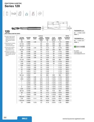 FRACTIONAL & METRIC Series 120 20° 145° 2 OAL LCF LS LU DC DCON 120 TOLERANCES (inch) FRACTIONAL & METRIC SERIES DC = +0.0000/–0.0005 DCON = h6 • Double margin design inch & mm EDP NO. stabilizes the drill forgreater hole accuracyCUTTINGDECIMAL METRIC SHANK OVERALL FLUTE SHANK Di-NAMITE®DIAMETEREQUIV.EQUIV.DIAMETERLENGTHLENGTHLENGTH(Diamond)TOLERANCES (mm) and improved surface DC DCON OAL LCF / LU LS DC = +0,000/–0,013 finish #40 0.0980 2.49 1/8 2 9/16 1-1/4 50000• Notched point reducesthrust force over2,7 mm0.10636,063,020,032,050001DCON = h6 conventional designs 3,0 mm 0.1181 6,0 63,0 20,0 36,0 50002 PLASTICS/COMPOSITES • 8 facet point reduces 1/8 0.1250 3.18 1/4 2-1/2 3/4 1-7/16 50003 fiber breakout and delamination on exit 3,2 mm 0.1260 6,0 63,0 20,0 36,0 50004 • 90 degree secondarychamfer angle improveshole entrance and exit#300.12853.261/4 2-1/2 3/4 1-7/16 50005#280.14053.571/42-1/23/41-7/1650006For patentinformation visitwww.ksptpatents.com quality #22 0.1570 3.99 1/4 2-5/8 7/8 1-7/16 50007 #21 0.1590 4.04 1/4 2-5/8 7/8 1-7/16 50008 4,1 mm 0.1614 6,0 66,0 24,0 36,0 50009 #19 0.1660 4.22 1/4 2-5/8 7/8 1-7/16 50010 11/64 0.1719 4.37 1/4 2-5/8 7/8 1-7/16 50011 3/16 0.1875 4.76 1/4 2-5/8 1 1-7/16 50012 #11 0.1910 4.85 1/4 2-5/8 1 1-7/16 50013 #8 0.1990 5.05 1/4 2-5/8 1 1-7/16 50014 #7 0.2010 5.11 1/4 2-5/8 1 1-7/16 50015 #2 0.2210 5.61 1/4 2-5/8 1 1-7/16 50016 6,0 mm 0.2362 6,0 66,0 28,0 36,0 50017 1/4 0.2500 6.35 1/4 3-1/8 1-5/16 1-7/16 50018 .2510 0.2510 6.38 5/16 3-1/8 1-5/16 1-7/16 50019 F 0.2570 6.53 5/16 3-1/8 1-5/16 1-7/16 50020 I 0.2720 6.91 5/16 3-1/8 1-5/16 1-7/16 50021 J 0.2770 7.04 5/16 3-1/8 1-5/16 1-7/16 50022 K 0.2810 7.14 5/16 3-1/8 1-9/16 1-7/16 50023 5/16 0.3125 7.94 5/16 3-1/8 1-9/16 1-7/16 50024 8,0 mm 0.3150 8,0 79,0 41,0 36,0 50025 3/8 0.3750 9.53 3/8 3-1/2 1-27/32 1-9/16 50026 V 0.3770 9.58 1/2 3-1/2 1-27/32 1-9/16 50027 10,0 mm 0.3937 10,0 89,0 47,0 40,0 50028 7/16 0.4375 11.11 1/2 4-1/16 2-3/16 1-9/16 50029 12,0 mm 0.4724 12,0 102,0 55,0 45,0 50030 1/2 0.5000 12.70 1/2 4-1/4 2-5/16 1-3/4 50031 282 DRILLS www.kDyRoIcLeLrSa-sgstool.com