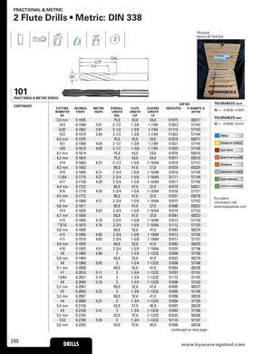 FRACTIONAL & METRIC 2 Flute Drills • Metric: DIN 338 20° 118° 2 Pictured:Series 101 Drill Set OAL LCF LU DC 101 FRACTIONAL & METRIC SERIES CONTINUED EDP NO. TOLERANCES (inch)CUTTINGDECIMALMETRICOVERALLFLUTECLEAREDUNCOATEDTi-NAMITE-ADIAMETEREQUIV.EQUIV.LENGTHLENGTHLENGTH(AlTiN)DC =+0.0000/–0.0005 DC3,9 mm 0.1535 OAL LCF LU75,043,034,061075 68317 TOLERANCES (mm) #23 0.1540 3.91 2-1/2 1-3/8 1-7/64 51023 57142 DC = + 0, 0 0 0 0 / – 0, 012 7 5/32 0.1562 3.97 2-1/2 1-3/8 1-7/64 51110 57143 #22 0.1570 3.99 2-1/2 1-3/8 1-7/64 51022 57144 STEELS 4,0 mm 0.1575 75,0 43,0 34,0 61019 68277 #21 0.1590 4.04 2-1/2 1-3/8 1-7/64 51021 57145 STAINLESS STEELS #20 0.1610 4.09 2-1/2 1-3/8 1-7/64 51020 57146 CAST IRON 4,1 mm 0.1614 75,0 43,0 34,0 61076 68318 4,2 mm 0.1654 75,0 43,0 34,0 61077 68319 HIGH TEMP ALLOYS #19 0.1660 4.22 2-1/2 1-5/8 1-19/64 51019 57147 TITANIUM 4,3 mm 0.1693 80,0 47,0 37,0 61078 68320 #18 0.1695 4.31 2-3/4 1-5/8 1-19/64 51018 57148 HARDENED STEELS 11/64 0.1719 4.37 2-3/4 1-5/8 1-19/64 51111 57149 NON-FERROUS #17 0.1730 4.39 2-3/4 1-5/8 1-19/64 51017 57150 4,4 mm 0.1732 80,0 47,0 37,0 61079 68321 PLASTICS/COMPOSITES #16 0.1770 4.50 2-3/4 1-5/8 1-19/64 51016 57151 4,5 mm 0.1772 80,0 47,0 37,0 61021#150.18004.572-3/41-5/81-19/64510156827857152For patentinformation visit 4,6 mm 0.1811 80,0 47,0 37,0 61080 68322 www.ksptpatents.com #14 0.1820 4.62 2-3/4 1-5/8 1-19/64 51014 57153 4,7 mm 0.1850 80,0 47,0 37,0 61081 68323 #13 0.1850 4.70 2-3/4 1-5/8 1-19/64 51013 57154 *3/16 0.1875 4.76 2-3/4 1-5/8 1-19/64 51112 57155 4,8 mm 0.1890 86,0 52,0 41,0 61082 68324 #12 0.1890 4.80 2-3/4 1-5/8 1-19/64 51012 57156 #11 0.1910 4.85 2-3/4 1-5/8 1-19/64 51011 57157 4,9 mm 0.1929 86,0 52,0 41,0 61083 68325 #10 0.1935 4.91 2-3/4 1-5/8 1-19/64 51010 57158 #9 0.1960 4.98 3 1-3/4 1-13/32 51009 57159 5,0 mm 0.1969 86,0 52,0 41,0 61023 68279 #8 0.1990 5.05 3 1-3/4 1-13/32 51008 57160 5,1 mm 0.2008 86,0 52,0 41,0 61084 68326 #7 0.2010 5.11 3 1-3/4 1-13/32 51007 57161 13/64 0.2031 5.16 3 1-3/4 1-13/32 51113 57162 #6 0.2040 5.18 3 1-3/4 1-13/32 51006 57163 5,2 mm 0.2047 86,0 52,0 41,0 61085 68327 #5 0.2055 5.22 3 1-3/4 1-13/32 51005 57164 5,3 mm 0.2087 86,0 52,0 41,0 61086 68328 #4 0.2090 5.31 3 1-3/4 1-13/32 51004 57165 5,4 mm 0.2126 93,0 57,0 45,0 61087 68329 #3 0.2130 5.41 3 1-3/4 1-13/32 51003 57166 5,5 mm 0.2165 93,0 57,0 1-13/32 61025 68280 7/32 0.2188 5.56 3 1-3/4 1-13/32 51114 57167 5,6 mm 0.2205 93,0 57,0 45,0 61088 68330 continued on next page 290 DRILLS www.kDyRoIcLeLrSa-sgstool.com