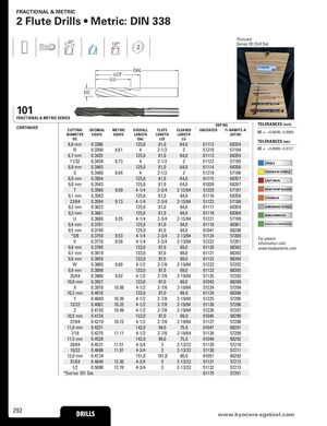FRACTIONAL & METRIC 2 Flute Drills • Metric: DIN 338 20° 118° 2 Pictured:Series 101 Drill Set OAL LCF LU DC 101 FRACTIONAL & METRIC SERIES CONTINUED EDP NO. TOLERANCES (inch)CUTTINGDECIMALMETRICOVERALLFLUTECLEAREDUNCOATEDTi-NAMITE-ADIAMETEREQUIV.EQUIV.LENGTHLENGTHLENGTH(AlTiN)DC =+0.0000/–0.0005 DC8,6 mm 0.3386 OAL LCF LU125,081,064,061112 68354 TOLERANCES (mm) R 0.3390 8.61 4 2-1/2 2 51218 57194 DC = + 0, 0 0 0 0 / – 0, 012 7 8,7 mm 0.3425 125,0 81,0 64,0 61113 68355 11/32 0.3438 8.73 4 2-1/2 2 51122 57195 STEELS 8,8 mm 0.3465 125,0 81,0 64,0 61114 68356 S 0.3480 8.84 4 2-1/2 2 51219 57196 STAINLESS STEELS 8,9 mm 0.3504 125,0 81,0 64,0 61115 68357 CAST IRON 9,0 mm 0.3543 125,0 81,0 64,0 61039 68287 T 0.3580 9.09 4-1/4 2-3/4 2-13/64 51220 57197 HIGH TEMP ALLOYS 9,1 mm 0.3583 125,0 81,0 64,0 61116 68358 TITANIUM 23/64 0.3594 9.13 4-1/4 2-3/4 2-13/64 51123 57198 9,2 mm 0.3622 125,0 81,0 64,0 61117 68359 HARDENED STEELS 9,3 mm 0.3661 125,0 81,0 64,0 61118 68360 NON-FERROUS U 0.3680 9.35 4-1/4 2-3/4 2-13/64 51221 57199 9,4 mm 0.3701 125,0 81,0 64,0 61119 68361 PLASTICS/COMPOSITES 9,5 mm 0.3740 125,0 81,0 64,0 61041 68288 *3/8 0.3750 9.53 4-1/4 2-3/4 2-13/64 51124 57200V0.37709.584-1/42-3/42-13/645122257201For patentinformation visit 9,6 mm 0.3780 133,0 87,0 69,0 61120 68362 www.ksptpatents.com 9,7 mm 0.3819 133,0 87,0 69,0 61121 68363 9,8 mm 0.3858 133,0 87,0 69,0 61122 68364 W 0.3860 9.80 4-1/2 2-7/8 2-19/64 51223 57202 9,9 mm 0.3898 133,0 87,0 69,0 61123 68365 25/64 0.3906 9.92 4-1/2 2-7/8 2-19/64 51125 57203 10,0 mm 0.3937 133,0 87,0 69,0 61043 68289 X 0.3970 10.08 4-1/2 2-7/8 2-19/64 51224 57204 10,2 mm 0.4016 133,0 87,0 69,0 61124 68366 Y 0.4040 10.26 4-1/2 2-7/8 2-19/64 51225 57205 13/32 0.4062 10.32 4-1/2 2-7/8 2-19/64 51126 57206 Z 0.4130 10.49 4-1/2 2-7/8 2-19/64 51226 57207 10,5 mm 0.4134 133,0 87,0 69,0 61045 68290 27/64 0.4219 10.72 4-1/2 2-7/8 2-19/64 51127 57208 11,0 mm 0.4331 142,0 94,0 75,0 61047 68291 7/16 0.4375 11.11 4-1/2 2-7/8 2-19/64 51128 57209 11,5 mm 0.4528 142,0 94,0 75,0 61049 68292 29/64 0.4531 11.51 4-3/4 3 2-13/32 51129 57210 15/32 0.4688 11.91 4-3/4 3 2-13/32 51130 57211 12,0 mm 0.4724 151,0 101,0 80,0 61051 68293 31/64 0.4844 12.30 4-3/4 3 2-13/32 51131 57212 1/2 0.5000 12.70 4-3/4 3 2-13/32 51132 57213 *Series 101 Set 61175 57351 292 DRILLS www.kDyRoIcLeLrSa-sgstool.com