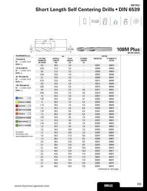 METRIC Short Length Self Centering Drills • DIN 6539 27° 145° 2 OAL LCF LU DC DCON 108M Plus METRIC SERIES TOLERANCES (mm) mm EDP NO, ≤3 DIAMETER CUTTING OVERALL FLUTE CLEARED UNCOATED Ti-NAMITE-ADIAMETERLENGTHLENGTHLENGTH(AlTiN) DC = +0,000/–0,010 DC / DCON OAL LCF LU DCON = h6 0,5 20,0 3,0 – 62001 68643 >3–6 DIAMETER 0,55 21,0 3,5 – 62003 68644 DC = +0,000/–0,012 0,6 21,0 3,5 – 62005 68645 DCON = h6 0,65 22,0 4,0 – 62007 68646 >6–10 DIAMETER 0,7 23,0 4,5 – 62009 68647 DC = +0,000/–0,015DCON = h6 0,75 23,0 4,5 – 62011 68648 0,8 24,0 5,0 – 62013 68649 >10–18 DIAMETERDC= +0,000/–0,018 0,85 24,0 5,0 – 62015 68650 DCON = h6 0,9 25,0 5,5 4,0 62017 68651 0,95 25,0 5,5 4,0 62019 68652 1,0 26,0 6,0 4,7 62021 68653 STEELS 1,05 26,0 6,0 4,7 62023 68654 STAINLESS STEELS 1,1 28,0 7,0 5,4 62025 68655 CAST IRON 1,15 28,0 7,0 5,4 62027 68656 1,2 30,0 8,0 6,0 62029 68657 HIGH TEMP ALLOYS 1,25 30,0 8,0 6,0 62031 68658 TITANIUM 1,3 30,0 8,0 6,0 62033 68659 HARDENED STEELS 1,35 32,0 9,0 7,0 62035 68660 1,4 32,0 9,0 7,0 62037 68661 NON-FERROUS 1,45 32,0 9,0 7,0 62039 68662 PLASTICS/COMPOSITES 1,5 32,0 9,0 7,0 62041 68663 1,6 34,0 10,0 7,0 62043 68664 For patent 1,7 34,0 10,0 7,0 62045 68665 information visit www.ksptpatents.com 1,8 36,0 11,0 8,0 62047 68666 1,9 36,0 11,0 8,0 62049 68667 2,0 38,0 12,0 9,0 62051 68668 2,1 38,0 12,0 9,0 62053 68669 2,2 40,0 13,0 10,0 62055 68670 2,3 40,0 13,0 10,0 62057 68671 2,4 43,0 14,0 11,0 62059 68672 2,5 43,0 14,0 11,0 62061 68673 2,6 43,0 14,0 11,0 62063 68674 2,7 46,0 16,0 12,0 62065 68675 2,8 46,0 16,0 12,0 62067 68676 continued on next page www.kyoceraD-sRgILsLtoSol.com DRILLS 293