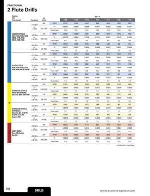 FRACTIONAL 2 Flute Drills Series DC • in 101 Vc Fractional Hardness (sfm) 1/64 1/32 1/16 1/8 1/4 3/8 1/2 265 RPM 64787 32394 16197 8098 4049 2699 2025 ≤ 175 Bhn or Fr 0.00021 0.0004 0.0008 0.0017 0.0033 0.0050 0.0067 ≤ 7 HRc (212-318) Feed (ipm) 13.5 13.5 13.5 13.5 13.5 13.5 13.5 CARBON STEELS1018, 1040, 1080, 1090,10L50, 1140, 1212,12L15, 1525, 1536≤ 300 Bhnor≤ 32 HRc125(100-150)RPMFrFeed (ipm)305600.000206.0152800.00046.076400.00086.038200.00166.019100.00316.012730.00476.09550.00636.0 ≤ 425 Bhn 85 RPM 20781 10390 5195 2598 1299 866 649 or Fr 0.00011 0.0002 0.0004 0.0008 0.0017 0.0025 0.0034 ≤ 45 HRc (68-102) Feed (ipm) 2.2 2.2 2.2 2.2 2.2 2.2 2.2 P 230 RPM 56230 28115 14058 7029 3514 2343 1757 ≤ 275 Bhn or Fr 0.00019 0.0004 0.0007 0.0015 0.0030 0.0045 0.0060 ≤ 28 HRc (184-276) Feed (ipm) 10.5 10.5 10.5 10.5 10.5 10.5 10.5 ALLOY STEELS ≤ 375 Bhn 145 RPM 35450 17725 8862 4431 2216 1477 1108 4140, 4150, 4320, 5120, or Fr 0.00019 0.0004 0.0007 0.0015 0.0030 0.0045 0.0060 5150, 8630, 86L20, 50100 ≤ 40 HRc (116-174) Feed (ipm) 6.6 6.6 6.6 6.6 6.6 6.6 6.6 60 RPM 14669 7334 3667 1834 917 611 458 ≤ 450 Bhn or Fr 0.00008 0.0002 0.0003 0.0007 0.0013 0.0020 0.0026 ≤ 48 HRc (48-72) Feed (ipm) 1.2 1.2 1.2 1.2 1.2 1.2 1.2 ≤ 250 Bhn 210 RPM 51341 25670 12835 6418 3209 2139 1604 or Fr 0.00015 0.0003 0.0006 0.0012 0.0024 0.0036 0.0048 STAINLESS STEELS ≤ 24 HRc (168-252) Feed (ipm) 7.7 7.7 7.7 7.7 7.7 7.7 7.7 (FREE MACHINING) 303, 416, 420F, 430F 440F ≤ 330 Bhn 110 RPM 26893 13446 6723 3362 1681 1121 840 or Fr 0.00009 0.0002 0.0004 0.0007 0.0015 0.0022 0.0030 ≤ 36 HRc (88-132) Feed (ipm) 2.5 2.5 2.5 2.5 2.5 2.5 2.5 M 65 RPM 15891 7946 3973 1986 993 662 497 ≤ 275 Bhn STAINLESS STEELS(DIFFICULT) or≤ 28 HRc(52-78) Fr 0.00010Feed (ipm)1.70.00021.70.00051.7 0.00091.7 0.00181.7 0.00251.7 0.00351.7 304, 316, 321, 13-8 PH, 15-5PH, 17-4 PH,Custom 450 55≤ 375 BhnorRPM 13446 6723 3362 1681 840 560 420Fr0.000100.00020.00040.00080.00150.00230.0031 ≤ 40 HRc (44-66) Feed (ipm) 1.3 1.3 1.3 1.3 1.3 1.3 1.3 280 RPM 68454 34227 17114 8557 4278 2852 2139 ≤ 220 Bhn or Fr 0.00026 0.0005 0.0010 0.0020 0.0041 0.0061 0.0082 CAST IRONS ≤ 19 HRc (224-336) Feed (ipm) 17.5 17.5 17.5 17.5 17.5 17.5 17.5 K Gray, Malleable, Ductile 250 RPM 61120 30560 15280 7640 3820 2547 1910≤ 330 Bhn or Fr 0.00025 0.0005 0.0010 0.0020 0.0041 0.0061 0.0081 ≤ 36 HRc (200-300) Feed (ipm) 15.5 15.5 15.5 15.5 15.5 15.5 15.5 continued on next page 296 DRILLS www.kDyRoIcLeLrSa-sgstool.com