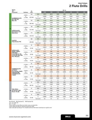 FRACTIONAL 2 Flute Drills Series DC • in 101 Vc Fractional Hardness (sfm) 1/64 1/32 1/16 1/8 1/4 3/8 1/2 540 RPM 132019 66010 33005 16502 8251 5501 4126 ≤ 80 Bhn or Fr 0.00030 0.0006 0.0012 0.0024 0.0048 0.0073 0.0097 ALUMINUM ALLOYS ≤ 47 HRb (432-648) Feed (ipm) 40.0 40.0 40.0 40.0 40.0 40.0 40.0 2017, 2024, 356, 6061, 7075 455 RPM 111238 55619 27810 13905 6952 4635 3476≤ 150 Bhn or Fr 0.00031 0.0006 0.0013 0.0025 0.0050 0.0076 0.0101 ≤ 7 HRc (364-546) Feed (ipm) 35.0 35.0 35.0 35.0 35.0 35.0 35.0 190 RPM 46451 23226 11613 5806 2903 1935 1452 ≤ 140 Bhn N or Fr 0.00015 0.0003 0.0006 0.0012 0.0024 0.0036 0.0048 COPPER ALLOYS ≤ 3 HRc (152-228) Feed (ipm) 7.0 7.0 7.0 7.0 7.0 7.0 7.0 Alum Bronze, C110, Muntz Brass 175 RPM 42784 21392 10696 5348 2674 1783 1337≤ 200 Bhn or Fr 0.00015 0.0003 0.0006 0.0012 0.0024 0.0036 0.0048 ≤ 23 HRc (140-210) Feed (ipm) 6.4 6.4 6.4 6.4 6.4 6.4 6.4 500 RPM 122240 61120 30560 15280 7640 5093 3820 PLASTICSPolycarbonate, PVC Fr 0.00031 0.0006 0.0012 0.0025 0.0050 0.0075 0.0099(400-600) Feed (ipm) 38.0 38.0 38.0 38.0 38.0 38.0 38.0 40 RPM 9779 4890 2445 1222 611 407 306 ≤ 220 Bhn or Fr 0.00010 0.0002 0.0004 0.0008 0.0016 0.0025 0.0033 ≤ 19 HRc (32-48) Feed (ipm) 1.0 1.0 1.0 1.0 1.0 1.0 1.0 SUPER ALLOYS (NICKEL, COBALT,IRON BASE)Inconel 601, 617, 625,Incoloy 800, Monel 400,≤ 320 Bhnor≤ 34 HRc25(20-30)RPMFrFeed (ipm)61120.000100.630560.00020.615280.00040.67640.00080.63820.00160.62550.00240.61910.00310.6 Rene, Waspaloy ≤ 425 Bhn 20 RPM 4890 2445 1222 611 306 204 153 or Fr 0.00004 0.0001 0.0002 0.0003 0.0007 0.0010 0.0013 ≤ 45 HRc (16-24) Feed (ipm) 0.2 0.2 0.2 0.2 0.2 0.2 0.2 S 85 RPM 20781 10390 5195 2598 1299 866 649 ≤ 275 Bhn or Fr 0.00020 0.0004 0.0008 0.0016 0.0032 0.0049 0.0065 ≤ 28 HRc (68-102) Feed (ipm) 4.2 4.2 4.2 4.2 4.2 4.2 4.2 TITANIUM ALLOYS (DIFFICULT)Pure Titanium, Ti6Al4V,Ti6Al2Sn4Zr2Mo,Ti4Al4Mo2Sn0.5Si,≤ 350 Bhnor≤ 38 HRc65(52-78)RPMFrFeed (ipm)158910.000111.779460.00021.739730.00041.719860.00091.79930.00171.76620.00261.74970.00341.7 Ti-6Al4V 55 RPM 13446 6723 3362 1681 840 560 420 ≤ 440 Bhn or Fr 0.00010 0.0002 0.0004 0.0008 0.0015 0.0023 0.0031 ≤ 47 HRc (44-66) Feed (ipm) 1.3 1.3 1.3 1.3 1.3 1.3 1.3 ≤ 250 Bhn 85 RPM 20781 10390 5195 2598 1299 866 649 or Fr 0.00011 0.0002 0.0004 0.0009 0.0018 0.0027 0.0035 ≤ 24 HRc (68-102) Feed (ipm) 2.3 2.3 2.3 2.3 2.3 2.3 2.3 55 RPM 13446 6723 3362 1681 840 560 420 TOOL STEELS ≤ 375 Bhn H A2, D2, H13, L2, M2, or Fr 0.00005 0.0001 0.0002 0.0004 0.0008 0.0012 0.0017 P20, S7, T15, W2 ≤ 40 HRc (44-66) Feed (ipm) 0.7 0.7 0.7 0.7 0.7 0.7 0.7 40 RPM 9779 4890 2445 1222 611 407 306 ≤ 475 Bhn or Fr 0.00005 0.0001 0.0002 0.0004 0.0008 0.0012 0.0016 ≤ 50 HRc (32-48) Feed (ipm) 0.5 0.5 0.5 0.5 0.5 0.5 0.5 Bhn (Brinell) HRc (Rockwell C) HRb (Rockwell B) rpm = Vc x 3.82 / DC ipm = Fr x rpm reduce speed and feed 30 percent when using uncoated drills reduce speed and feed for materials harder than listed refer to the SGS Tool Wizard® for complete technical information (www.kyocera-sgstool.com) www.kyoceraD-sRgILsLtoSol.com DRILLS 297