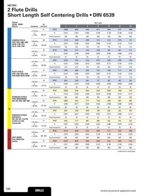 METRIC 2 Flute Drills Short Length Self Centering Drills • DIN 6539 Series DC • mm 101M, 108M Vc Metric Hardness (m/min) 1 3 6 8 10 12 16 81 RPM 25690 8563 4282 3211 2569 2141 1606 ≤ 175 Bhn or Fr 0.014 0.041 0.082 0.109 0.136 0.163 0.218 ≤ 7 HRc (65-97) Feed (mm/min) 350 350 350 350 350 350 350 CARBON STEELS1018, 1040, 1080, 1090,10L50, 1140, 1212,12L15, 1525, 1536≤ 300 Bhnor≤ 32 HRc38(30-46)RPMFrFeed (mm/min)121180.01214540390.03614520200.07214515150.09614512120.12014510100.1441457570.191145 26 RPM 8240 2747 1373 1030 824 687 515 ≤ 425 Bhn or Fr 0.007 0.020 0.040 0.053 0.067 0.080 0.107 ≤ 45 HRc (21-31) Feed (mm/min) 55 55 55 55 55 55 55 P 70 RPM 22297 7432 3716 2787 2230 1858 1394 ≤ 275 Bhn or Fr 0.012 0.036 0.073 0.097 0.121 0.145 0.194 ≤ 28 HRc (56-84) Feed (mm/min) 270 270 270 270 270 270 270 44 RPM 14057 4686 2343 1757 1406 1171 879 ALLOY STEELS ≤ 375 Bhn 4140, 4150, 4320, 5120, or Fr 0.012 0.036 0.073 0.097 0.121 0.145 0.194 5150, 8630, 86L20, 50100 ≤ 40 HRc (35-53) Feed (mm/min) 170 170 170 170 170 170 170 18 RPM 5816 1939 969 727 582 485 364 ≤ 450 Bhn or Fr 0.005 0.015 0.030 0.040 0.050 0.060 0.080 ≤ 48 HRc (15-22) Feed (mm/min) 29 29 29 29 29 29 29 64 RPM 20358 6786 3393 2545 2036 1696 1272 ≤ 250 Bhn or Fr 0.010 0.029 0.059 0.079 0.098 0.118 0.157 STAINLESS STEELS ≤ 24 HRc (51-77) Feed (mm/min) 200 200 200 200 200 200 200 (FREE MACHINING) 303, 416, 420F, 430F 440F ≤ 330 Bhn 34 RPM 10664 3555 1777 1333 1066 889 666 or Fr 0.006 0.017 0.034 0.045 0.056 0.068 0.090 ≤ 36 HRc (27-40) Feed (mm/min) 60 60 60 60 60 60 60 M 20 RPM 6301 2100 1050 788 630 525 394 ≤ 275 Bhn STAINLESS STEELS(DIFFICULT) or Fr 0.007≤ 28 HRc(16-24)Feed (mm/min)450.021450.043450.057450.07145 0.08645 0.11445 304, 316, 321, 13-8 PH, 15-5PH, 17-4 PH,Custom 450 17≤ 375 BhnorRPM 5332 1777 889 666 533 444 333Fr0.0070.0200.0390.0530.0660.0790.105 ≤ 40 HRc (13-20) Feed (mm/min) 35 35 35 35 35 35 35 85 RPM 27144 9048 4524 3393 2714 2262 1696 ≤ 220 Bhn or Fr 0.016 0.049 0.097 0.130 0.162 0.195 0.259 CAST IRONS ≤ 19 HRc (68-102) Feed (mm/min) 440 440 440 440 440 440 440 K Gray, Malleable, Ductile 76 RPM 24235 8078 4039 3029 2424 2020 1515≤ 330 Bhn or Fr 0.017 0.050 0.099 0.132 0.165 0.198 0.264 ≤ 36 HRc (61-91) Feed (mm/min) 400 400 400 400 400 400 400 continued on next page 298 DRILLS www.kDyRoIcLeLrSa-sgstool.com