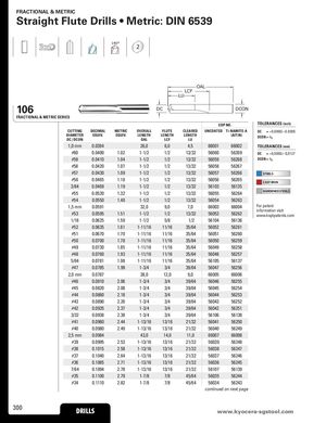 FRACTIONAL & METRIC Straight Flute Drills • Metric: DIN 6539 140° 2 OAL LCF LU 106 DC DCON FRACTIONAL & METRIC SERIES EDP NO. TOLERANCES (inch) CUTTING DECIMAL METRIC OVERALL FLUTE CLEARED UNCOATED Ti-NAMITE-A DC = +0.0000/–0.0005 DIAMETER EQUIV. EQUIV. LENGTH LENGTH LENGTHDC / DCONOALLCFLU (AlTiN) DCON = h6 1,0 mm 0.0394 26,0 6,0 4,5 66001 66002 TOLERANCES (mm) #60 0.0400 1.02 1-1/2 1/2 13/32 56060 56269 DC = +0,0000/–0,0127 #59 0.0410 1.04 1-1/2 1/2 13/32 56059 56268 DCON = h6 #58 0.0420 1.07 1-1/2 1/2 13/32 56058 56267 #57 0.0430 1.09 1-1/2 1/2 13/32 56057 56266 STEELS #56 0.0465 1.18 1-1/2 1/2 13/32 56056 56265 CAST IRON 3/64 0.0469 1.19 1-1/2 1/2 13/32 56103 56135 #55 0.0520 1.32 1-1/2 1/2 13/32 56055 56264 HARDENED STEELS #54 0.0550 1.40 1-1/2 1/2 13/32 56054 56263 1,5 mm 0.0591 32,0 9,0 7,0 66003 66004 For patent #53 0.0595 1.51 1-1/2 1/2 13/32 56053 56262 information visitwww.ksptpatents.com 1/16 0.0625 1.59 1-1/2 5/8 1/2 56104 56136 #52 0.0635 1.61 1-11/16 11/16 35/64 56052 56261 #51 0.0670 1.70 1-11/16 11/16 35/64 56051 56260 #50 0.0700 1.78 1-11/16 11/16 35/64 56050 56259 #49 0.0730 1.85 1-11/16 11/16 35/64 56049 56258 #48 0.0760 1.93 1-11/16 11/16 35/64 56048 56257 5/64 0.0781 1.98 1-11/16 11/16 35/64 56105 56137 #47 0.0785 1.99 1-3/4 3/4 39/64 56047 56256 2,0 mm 0.0787 38,0 12,0 9,0 66005 66006 #46 0.0810 2.06 1-3/4 3/4 39/64 56046 56255 #45 0.0820 2.08 1-3/4 3/4 39/64 56045 56254 #44 0.0860 2.18 1-3/4 3/4 39/64 56044 56253 #43 0.0890 2.26 1-3/4 3/4 39/64 56043 56252 #42 0.0935 2.37 1-3/4 3/4 39/64 56042 56251 3/32 0.0938 2.38 1-3/4 3/4 39/64 56106 56138 #41 0.0960 2.44 1-13/16 13/16 21/32 56041 56250 #40 0.0980 2.49 1-13/16 13/16 21/32 56040 56249 2,5 mm 0.0984 43,0 14,0 11,0 66007 66008 #39 0.0995 2.53 1-13/16 13/16 21/32 56039 56248 #38 0.1015 2.58 1-13/16 13/16 21/32 56038 56247 #37 0.1040 2.64 1-13/16 13/16 21/32 56037 56246 #36 0.1065 2.71 1-13/16 13/16 21/32 56036 56245 7/64 0.1094 2.78 1-13/16 13/16 21/32 56107 56139 #35 0.1100 2.79 1-7/8 7/8 45/64 56035 56244 #34 0.1110 2.82 1-7/8 7/8 45/64 56034 56243 continued on next page 300 DRILLS www.kDyRoIcLeLrSa-sgstool.com