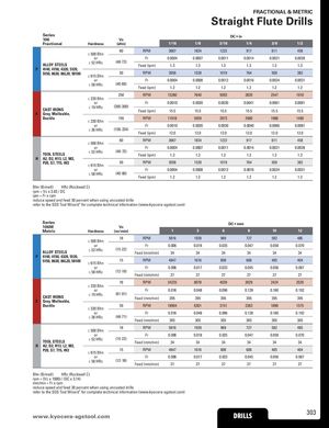 FRACTIONAL & METRIC Straight Flute Drills Series DC • in 106 Vc Fractional Hardness (sfm) 1/16 1/8 3/16 1/4 3/8 1/2 60 RPM 3667 1834 1222 917 611 458 ≤ 500 Bhn or Fr 0.0004 0.0007 0.0011 0.0014 0.0021 0.0028 ALLOY STEELS ≤ 52 HRc (48-72) Feed (ipm) 1.3 1.3 1.3 1.3 1.3 1.3 P 4140, 4150, 4320, 5120, 5150, 8630, 86L20, 50100 ≤ 615 Bhn 50 RPM 3056 1528 1019 764 509 382 or Fr 0.0004 0.0008 0.0012 0.0016 0.0024 0.0031 ≤ 58 HRc (40-60) Feed (ipm) 1.2 1.2 1.2 1.2 1.2 1.2 250 RPM 15280 7640 5093 3820 2547 1910 ≤ 220 Bhn or Fr 0.0010 0.0020 0.0030 0.0041 0.0061 0.0081 CAST IRONS ≤ 19 HRc (200-300) Feed (ipm) 15.5 15.5 15.5 15.5 15.5 15.5 K Gray, Malleable, Ductile 195 RPM 11918 5959 3973 2980 1986 1490≤ 330 Bhn or Fr 0.0010 0.0020 0.0030 0.0040 0.0060 0.0081 ≤ 36 HRc (156-234) Feed (ipm) 12.0 12.0 12.0 12.0 12.0 12.0 ≤ 500 Bhn 60 RPM 3667 1834 1222 917 611 458 or Fr 0.0004 0.0007 0.0011 0.0014 0.0021 0.0028 TOOL STEELS ≤ 52 HRc (48-72) Feed (ipm) 1.3 1.3 1.3 1.3 1.3 1.3 H A2, D2, H13, L2, M2, P20, S7, T15, W2 50≤ 615 Bhn RPM 3056 1528 1019 764 509 382 or Fr 0.0004 0.0008 0.0012 0.0016 0.0024 0.0031 ≤ 58 HRc (40-60) Feed (ipm) 1.2 1.2 1.2 1.2 1.2 1.2 Bhn (Brinell) HRc (Rockwell C) rpm = Vc x 3.82 / DC ipm = Fr x rpm reduce speed and feed 30 percent when using uncoated drills refer to the SGS Tool Wizard® for complete technical information (www.kyocera-sgstool.com) Series DC • mm 106M Vc Metric Hardness (m/min) 1 3 6 8 10 12 18 RPM 5816 1939 969 727 582 485 ≤ 500 Bhn or Fr 0.006 0.018 0.035 0.047 0.058 0.070 ALLOY STEELS ≤ 52 HRc (15-22) Feed (mm/min) 34 34 34 34 34 34 P 4140, 4150, 4320, 5120, 5150, 8630, 86L20, 50100 ≤ 615 Bhn 15 RPM 4847 1616 808 606 485 404 or Fr 0.006 0.017 0.033 0.045 0.056 0.067 ≤ 58 HRc (12-18) Feed (mm/min) 27 27 27 27 27 27 76 RPM 24235 8078 4039 3029 2424 2020 ≤ 220 Bhn or Fr 0.016 0.048 0.096 0.128 0.160 0.192 CAST IRONS ≤ 19 HRc (61-91) Feed (mm/min) 395 395 395 395 395 395 K Gray, Malleable, Ductile 59 RPM 18904 6301 3151 2363 1890 1575≤ 330 Bhn or Fr 0.016 0.048 0.096 0.128 0.160 0.192 ≤ 36 HRc (48-71) Feed (mm/min) 305 305 305 305 305 305 ≤ 500 Bhn 18 RPM 5816 1939 969 727 582 485 or Fr 0.006 0.018 0.035 0.047 0.058 0.070 TOOL STEELS ≤ 52 HRc (15-22) Feed (mm/min) 34 34 34 34 34 34 H A2, D2, H13, L2, M2, P20, S7, T15, W2 15≤ 615 Bhn RPM 4847 1616 808 606 485 404 or Fr 0.006 0.017 0.033 0.045 0.056 0.067 ≤ 58 HRc (12-18) Feed (mm/min) 27 27 27 27 27 27 Bhn (Brinell) HRc (Rockwell C) rpm = (Vc x 1000) / (DC x 3.14) mm/min = Fr x rpm reduce speed and feed 30 percent when using uncoated drills refer to the SGS Tool Wizard® for complete technical information (www.kyocera-sgstool.com) www.kyoceraD-sRgILsLtoSol.com DRILLS 303