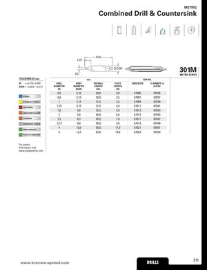 METRIC Combined Drill & Countersink 118° 2 60° OAL LCF DCON 301M DC METRIC SERIES TOLERANCES (mm) mm EDP NO. DC = +0,076/–0,000 DRILL BODY OVERALL FLUTE UNCOATED Ti-NAMITE-A DCON = –0,0025/–0,0127 DIAMETER DIAMETER LENGTH LENGTH (AlTiN) DC DCON OAL LCF 0,5 3,15 20,0 3,0 67005 67035 STEELS 0,8 3,15 20,0 3,5 67007 67037 STAINLESS STEELS 1 3,15 31,5 3,5 67009 67039 CAST IRON 1,25 3,15 31,5 4,0 67011 67041 1,6 4,0 35,5 5,0 67013 67043 HIGH TEMP ALLOYS 2 5,0 40,0 6,0 67015 67045 TITANIUM 2,5 6,3 45,0 7,0 67017 67047 HARDENED STEELS 3,15 8,0 50,0 9,0 67019 67049 4 10,0 56,0 11,0 67021 67051 NON-FERROUS 5 12,5 63,0 14,0 67023 67053 PLASTICS/COMPOSITES For patent information visit www.ksptpatents.com www.kyoceraD-sRgILsLtoSol.com DRILLS 311