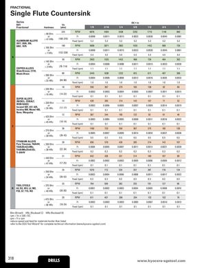 FRACTIONAL Single Flute Countersink Series DC • in 601 Vc Fractional Hardness (sfm) 1/8 3/16 1/4 3/8 1/2 3/4 1 225 RPM 6876 4584 3438 2292 1719 1146 860 ≤ 80 Bhn or Fr 0.0008 0.0011 0.0015 0.0023 0.0030 0.0045 0.0061 ALUMINUM ALLOYS ≤ 47 HRb (180-270) Feed (ipm) 5.2 5.2 5.2 5.2 5.2 5.2 5.2 2017, 2024, 356, 6061, 7075 190 RPM 5806 3871 2903 1935 1452 968 726≤ 150 Bhn or Fr 0.0008 0.0011 0.0015 0.0023 0.0030 0.0045 0.0061 ≤ 7 HRc (152-228) Feed (ipm) 4.4 4.4 4.4 4.4 4.4 4.4 4.4 N 95 RPM 2903 1935 1452 968 726 484 363 ≤ 140 Bhn or Fr 0.0004 0.0006 0.0008 0.0011 0.0015 0.0023 0.0030 COPPER ALLOYS ≤ 3 HRc (76-114) Feed (ipm) 1.1 1.1 1.1 1.1 1.1 1.1 1.1 Alum Bronze, C110, Muntz Brass 80 RPM 2445 1630 1222 815 611 407 306≤ 200 Bhn or Fr 0.0004 0.0006 0.0008 0.0012 0.0016 0.0025 0.0033 ≤ 23 HRc (64-96) Feed (ipm) 1.0 1.0 1.0 1.0 1.0 1.0 1.0 18 RPM 550 367 275 183 138 92 69 ≤ 220 Bhn or Fr 0.0002 0.0003 0.0004 0.0005 0.0007 0.0011 0.0015 ≤ 19 HRc (14-22) Feed (ipm) 0.1 0.1 0.1 0.1 0.1 0.1 0.1 SUPER ALLOYS (NICKEL, COBALT,IRON BASE)Inconel 601, 617, 625,Incoloy 800, Monel 400,≤ 320 Bhnor≤ 34 HRc14(11-17)RPMFrFeed (ipm)4280.00020.12850.00040.12140.00050.11430.00070.11070.00090.1710.00140.1530.00190.1 Rene, Waspaloy 12 RPM 367 244 183 122 92 61 46 ≤ 425 Bhn or Fr 0.0003 0.0004 0.0005 0.0008 0.0011 0.0016 0.0022 ≤ 45 HRc (10-14) Feed (ipm) 0.1 0.1 0.1 0.1 0.1 0.1 0.1 S 36 RPM 1100 733 550 367 275 183 138 ≤ 275 Bhn or Fr 0.0005 0.0007 0.0009 0.0014 0.0018 0.0027 0.0036 ≤ 28 HRc (29-43) Feed (ipm) 0.5 0.5 0.5 0.5 0.5 0.5 0.5 TITANIUM ALLOYS 28 RPM 856 570 428 285 214 143 107 Pure Titanium, Ti6Al4V, ≤ 350 Bhn Ti6Al2Sn4Zr2Mo, or Fr 0.0004 0.0005 0.0007 0.0011 0.0014 0.0021 0.0028 Ti4Al4Mo2Sn0.5Si, ≤ 38 HRc (22-34) Ti-6Al4V Feed (ipm) 0.3 0.3 0.3 0.3 0.3 0.3 0.3 ≤ 440 Bhn 21 RPM 642 428 321 214 160 107 80 or Fr 0.0002 0.0002 0.0003 0.0005 0.0006 0.0009 0.0012 ≤ 47 HRc (17-25) Feed (ipm) 0.1 0.1 0.1 0.1 0.1 0.1 0.1 35 RPM 1070 713 535 357 267 178 134 ≤ 250 Bhn or Fr 0.0003 0.0004 0.0006 0.0008 0.0011 0.0017 0.0022 ≤ 24 HRc (28-42) Feed (ipm) 0.3 0.3 0.3 0.3 0.3 0.3 0.3 TOOL STEELS ≤ 375 Bhn 25 RPM 764 509 382 255 191 127 96 H A2, D2, H13, L2, M2, or Fr 0.0001 0.0002 0.0003 0.0004 0.0005 0.0008 0.0010 P20, S7, T15, W2 ≤ 40 HRc (20-30) Feed (ipm) 0.1 0.1 0.1 0.1 0.1 0.1 0.1 20 RPM 611 407 306 204 153 102 76 ≤ 475 Bhn or Fr 0.0002 0.0002 0.0003 0.0005 0.0007 0.0010 0.0013 ≤ 50 HRc (16-24) Feed (ipm) 0.1 0.1 0.1 0.1 0.1 0.1 0.1 Bhn (Brinell) HRc (Rockwell C) HRb (Rockwell B) rpm = Vc x 3.82 / DC ipm = Fr x rpm reduce speed and feed for materials harder than listed refer to the SGS Tool Wizard® for complete technical information (www.kyocera-sgstool.com) 318 DRILLS www.kDyRoIcLeLrSa-sgstool.com
